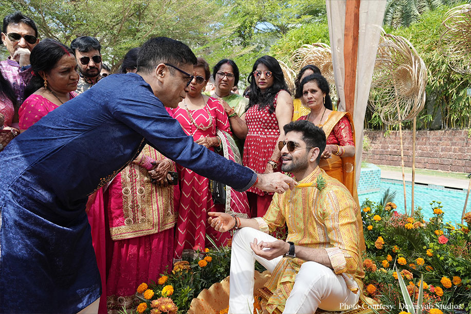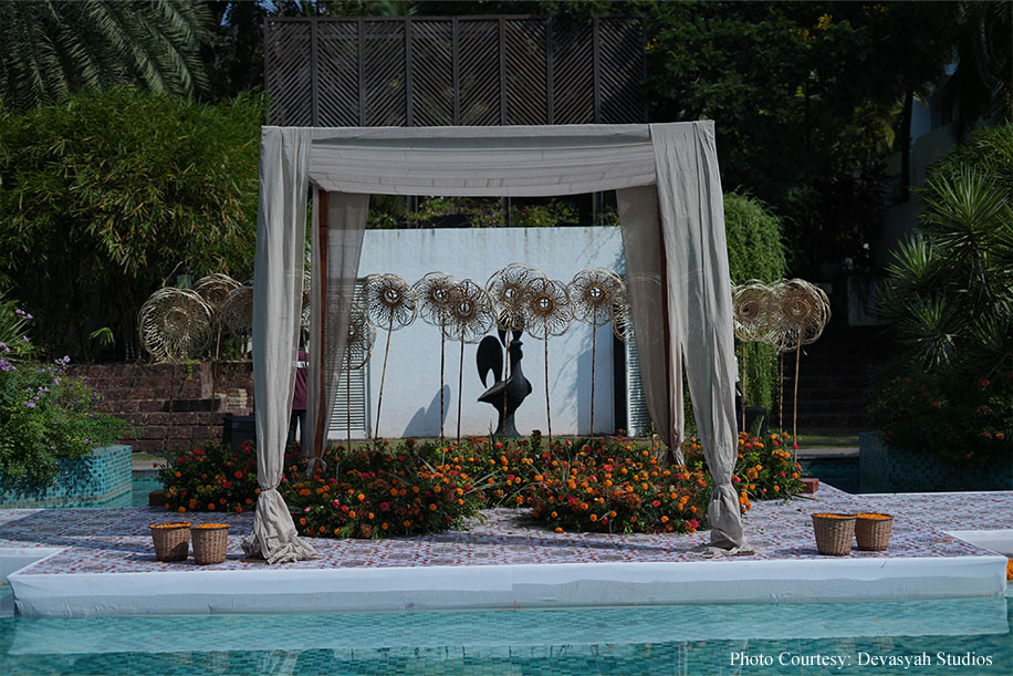 The Haldi ceremony was infused with the joyful hues of yellow and orange. Jute-made flowers and a unique seating arrangement for the bride and groom, set by an artificial pond, added a rustic charm. The flower shower during the ceremony enhanced the traditional spirit of this ritual, creating a beautiful and memorable experience for all.