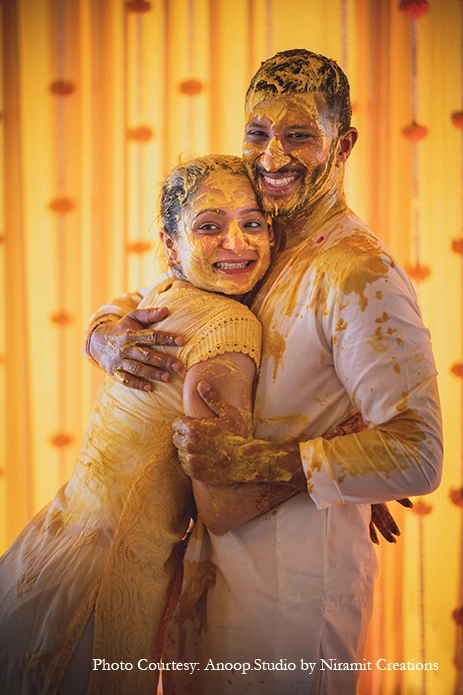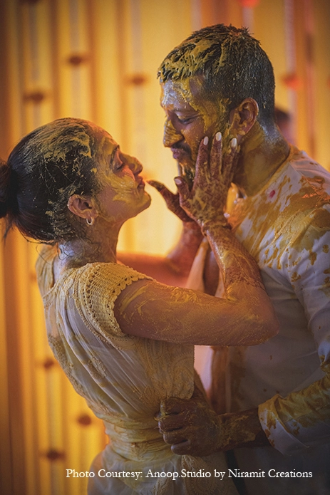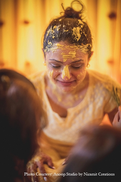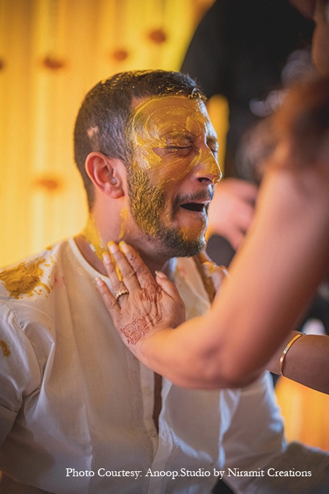 The haldi was followed by the bride’s choora ceremony after which they spent the day with some pool fun before getting ready for the evening nuptials.