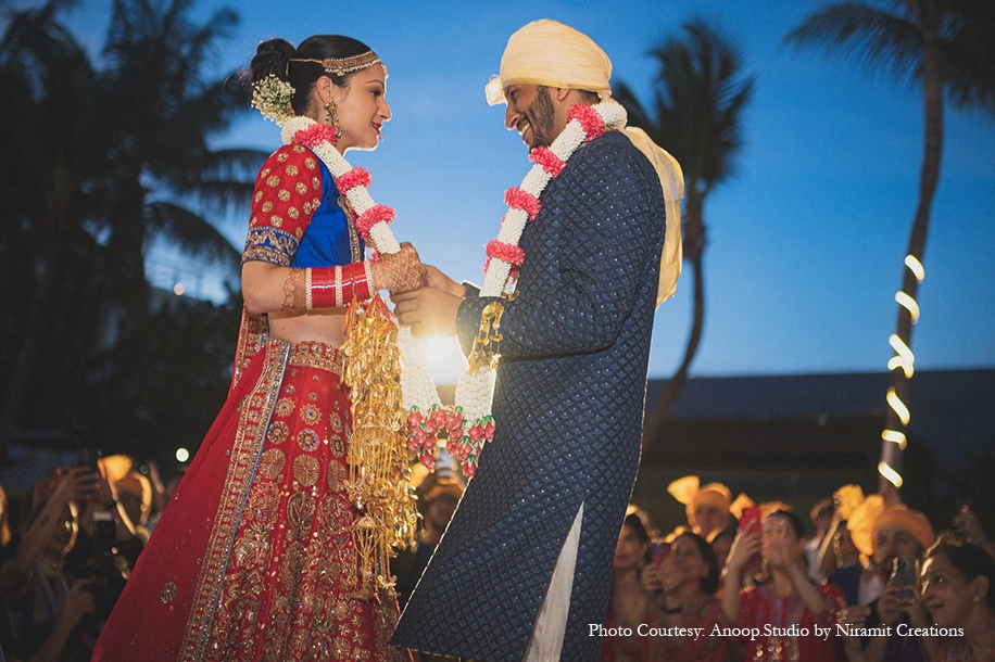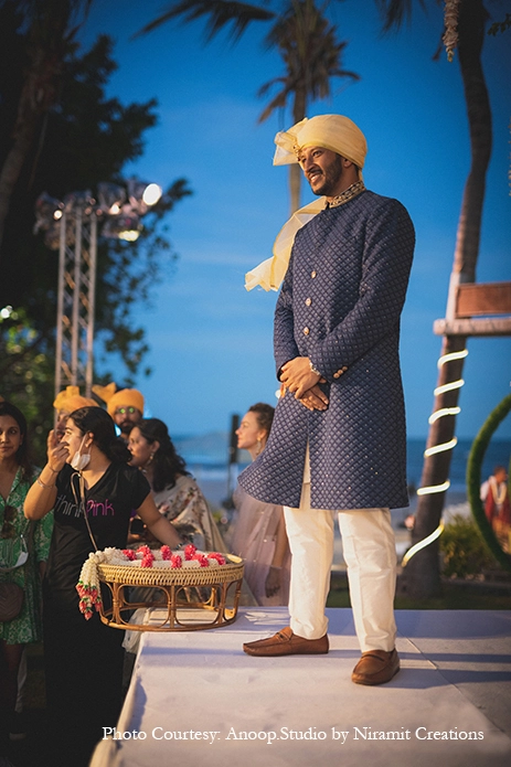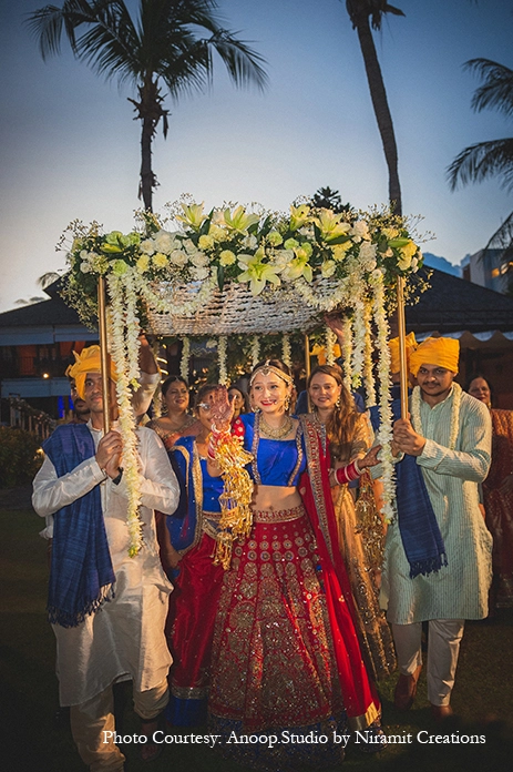 Hosted by the beach, the wedding was imagined with the earthy, elegant decor of white blooms, foliage, lamps, fairy lights, and more, that delicately elevated the natural beauty of the tropical venue. The structural mandap made of exotic blooms and leaves looked striking against the rolling waves and striking sunset sky. The groom arrived with a rousing baraat, after which the bride left everyone awestruck as she arrived with her family under a beautiful phoolon ki chadar. Designed entirely by her father, her stunning wedding lehenga of red and royal blue was a retelling of Lord Shiva and Parvati’s love story, a nod to the bride’s name. A total surprise for the bride, the outfit not only was an emotional gift but also inspired and connected all of the decor concepts, making for an unforgettable experience. The couple tied the knot to the symphony of the waves beyond, after which they celebrated with a sangeet, dances, dinner, and an after-party.