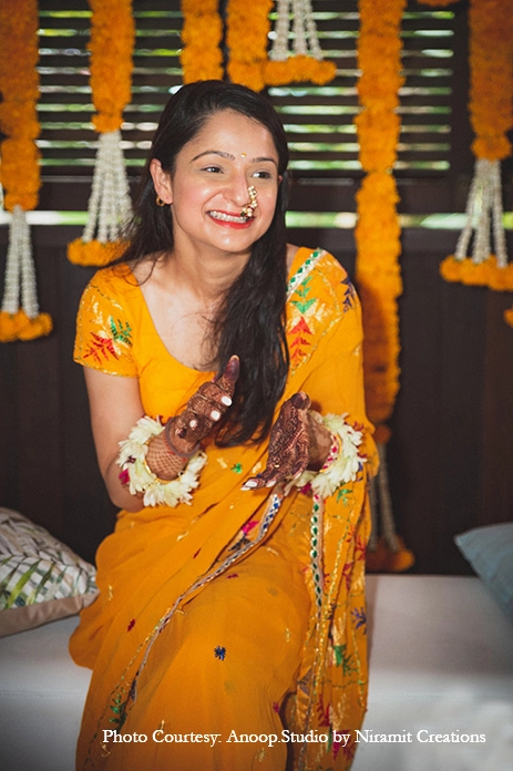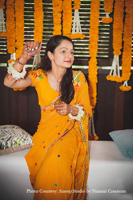 The next day began with an intimate Haldi ceremony for the bride and groom. Flowing drapes and aesthetic arrangements of marigolds set a traditional tone with a minimalist ethos for the occasion. The bride and groom sat in large urlis as their loved ones anointed them with haldi and love.