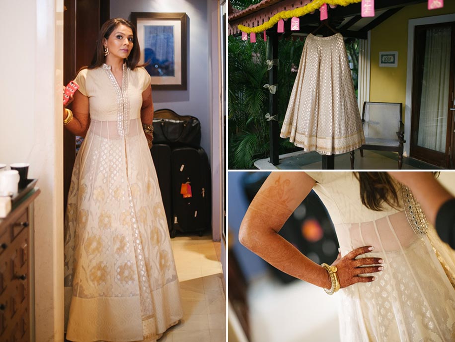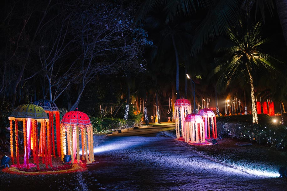 The wedding celebrations began with triple pre-wedding events – sangeet, mehndi and the cocktail night – all on the first evening. Held on the resort’s Bay View lawns which can easily accommodate 1,000 people, the sangeet and mehndi featured a heady mix of bright colors. Gayatri wore a beautiful anarkali-style cream and beige ensemble with stunning gold thread motifs. Guests enjoyed lounging on colorful divans and bolsters while getting their mehndi applied. A traditional swing was festooned with bright garlands and lustrous cushions, while another photo stop was the quaint aqua scooter standing in front of an avante garden decor frame. The sangeet saw Gayatri grooving to Bollywood numbers as her loved ones joined in. Christopher looked polished in his dark blue suit which was paired with a crisp white shirt