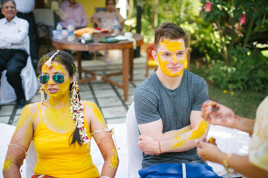 Yellow was the dominating colour of the haldi (turmeric) ceremony the following day which featured decor that included white and pink accents alongside yellow, such as garlands and pink danglers. Even the wedding guests wore these hues in an eye-catching and coordinated way. Gayatri donned an orange and yellow lehenga by Ritu Kumar which came with a comfortable yellow tank top instead of a formal choli (blouse). For trendy ‘desi swag’ she flaunted reflective RayBan sunglasses and interesting ‘floral jewellery’ in the form of a necklace, ‘maang tikka’, arm bands and earrings. She also wore a set of traditional red ‘choodas’ (Punjabi bridal bangles), while Christopher kept in casual in trousers and a tee-shirt and seemed to enjoy getting plastered with bright yellow turmeric paste which was applied to him by laughing ladies of Gayatri’s family.