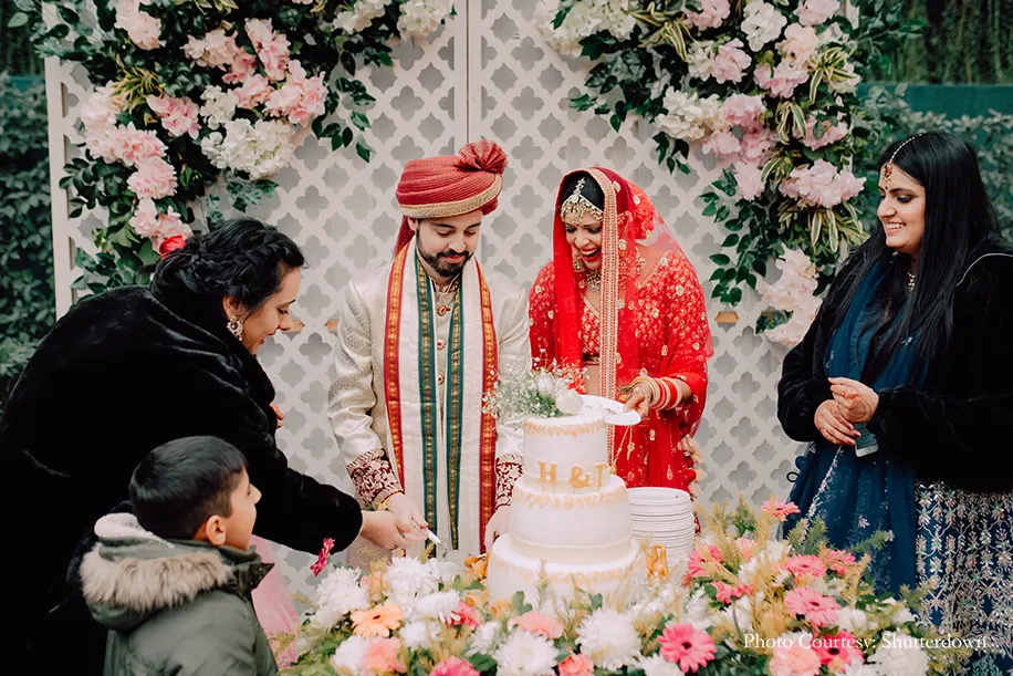 The bride shares, “I wanted the wedding to be very traditional, and we kept a décor of dainty flowers in ivory and peach, which made the quintessential red of our outfits pop. We first held the Sikh nuptial ceremony, followed by a Hindu one, after which we finally exchanged our vows, honoring all our cultures. The guests were served hot chai throughout the wedding to keep the winter chills at bay. They were also gifted with wedding favors made by my best friend that included a spice box and a recipe booklet of my mom’s favorite Indian dishes. My friend had also previously designed our invites, which we absolutely loved. The intimate function saw heartfelt speeches from our family and emotional moments of tears and love.”