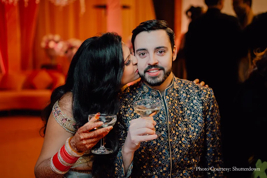 The festivities concluded with a fun reception party where everyone drank, danced and enjoyed to their fullest. The bride wore an icy blue lehenga by Sulakshana Monga that perfectly complemented the groom’s navy sherwani and looked divine amidst the pretty pastel décor and floral canopy. The band Moongphali performed live, followed by a DJ that had everyone grooving to his tunes. The bar served shots in what looked like grenades which could be lit to open, and a champagne tower added to the splendor of the evening. There was also an old school photo booth for people to print out their fun pictures.