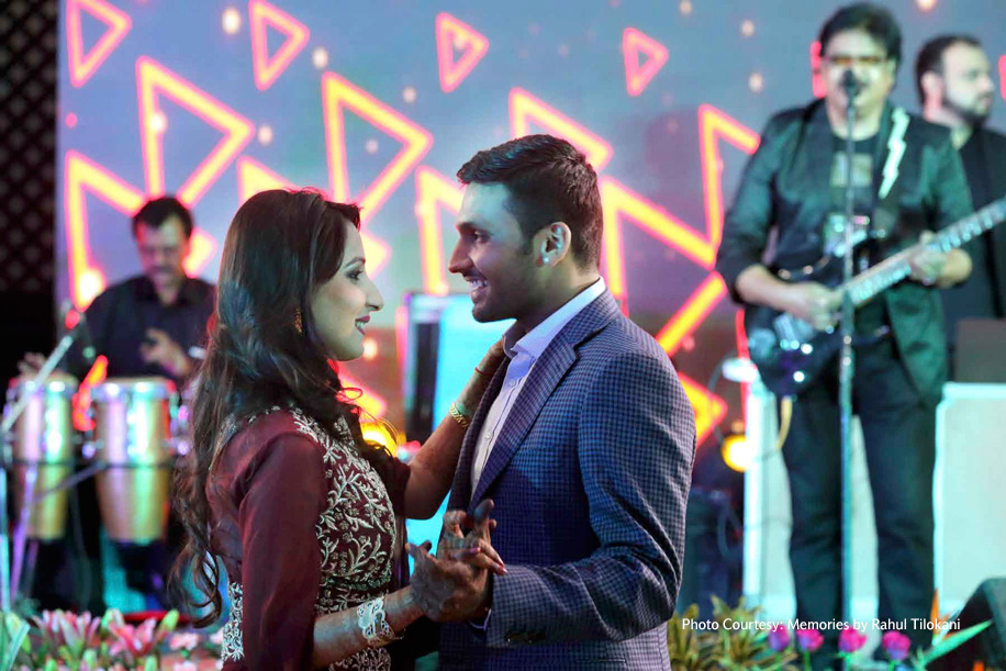 “The mehndi ceremony was held on the next day, and we were entertained by our friends and family dancing relentlessly with so much energy and so much color. The function was held outdoors on the lawns of the hotel, and featured bright and beautiful decor in the form of garlands, draped canopies, colorful cushions and a ‘Love’ sign created with orange marigold blooms.” Playback Singer Deepali Sathe and Supriya Joshi performed at the ceremony followed by a Rajasthani Ger performance and India’s leading professional dance troupe Dance Smith performance based on a Vivah concept. For Mehndi, Harshika and Ronak coordinated their Alok and Harsh outfits that matched perfectly with the colorful decor.