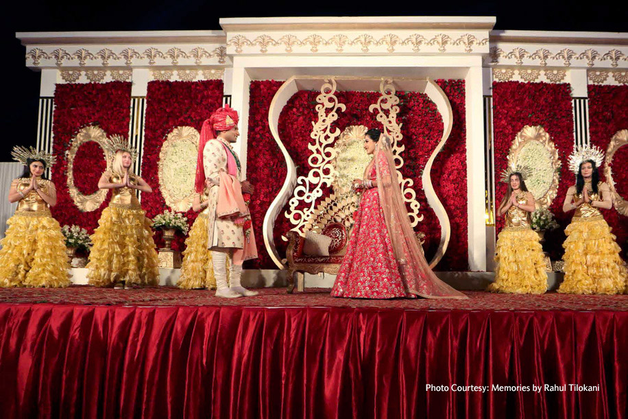 “Our wedding celebrations started with a Welcome Dinner on the first night. We were entertained by a Tanura act, some Retro and Dance acts, and a brilliant performance by Bollywood Playback Singer Sapna Mukherjee before dinner. The gorgeous venue was set up and we chose to go with a decor theme which not only gave it a very beautiful setting but also added a touch of elegant exuberance to the proceedings. Colored Moroccan lamps were placed on each table, and impressive floral arrangements lit up the entrance to the dining venue.” While Harshika wore a gorgeous crimson ensemble pairing it with statement earrings, Ronak looked every bit of a dapper groom in his Grey suit from Canali.