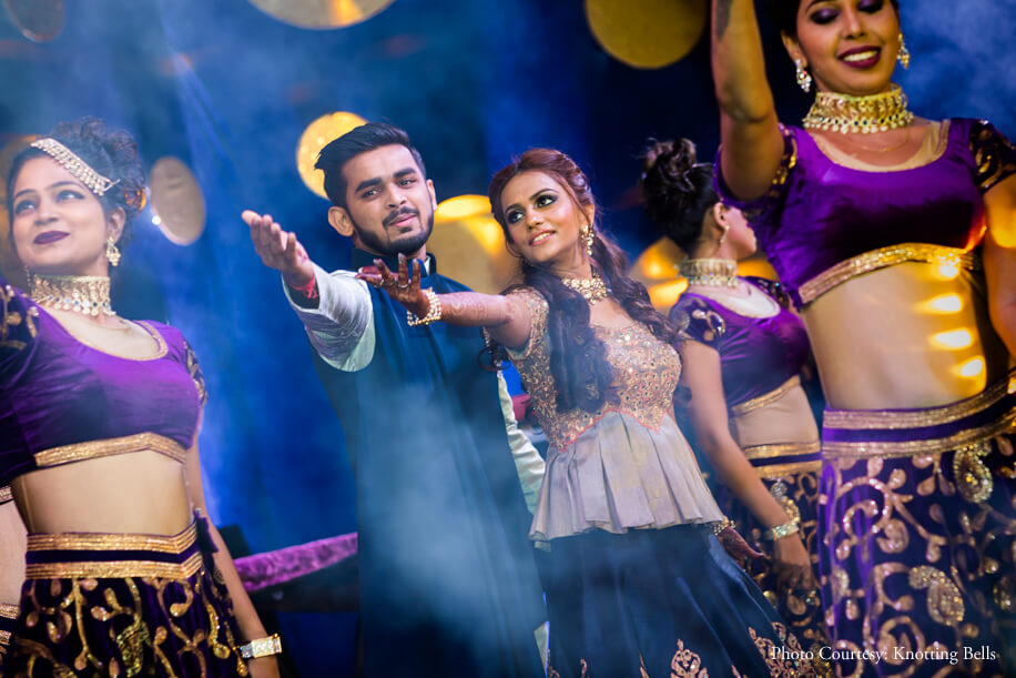 “We hosted our sangeet the following evening, and it was the most happening event of all! The decor was stunning with flowers and fairy lights. We followed a dark color dress code with a deep blue and gold palette for our ensembles.”