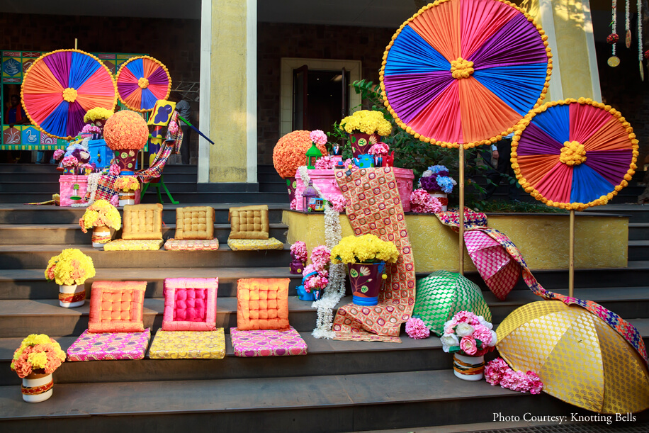 “Our wedding festivities began on a bright and colorful note with the mehndi. The decor included vibrant cushions, umbrellas, and charming flower pots which set the perfect vibe for the outdoor function. Further, the dhol (traditional drums) players had everyone dancing in high spirits!”