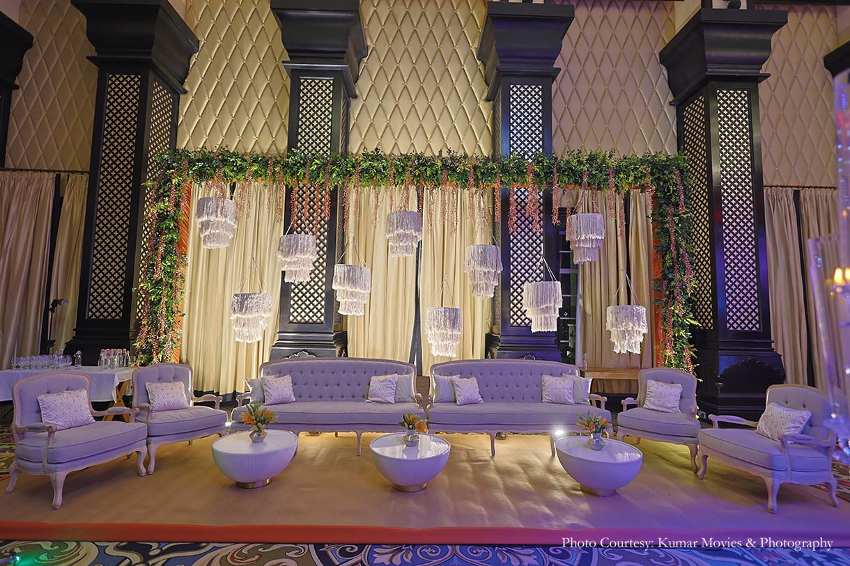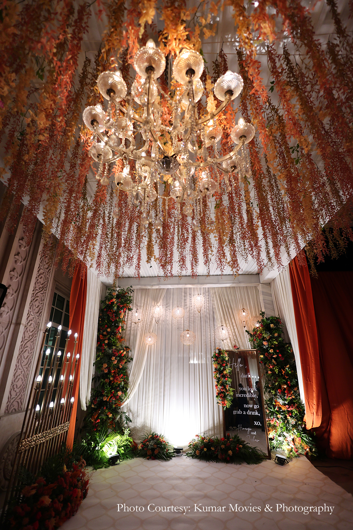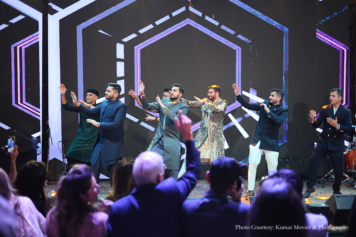 After the auspicious and serene Devgon ceremony, the couple amped up the glamour levels with a glitzy sangeet. Crystal chandeliers gave the venue’s entrance a soft warm glow and lights shaped like elegant flowers lit the way for the guests. Once inside, the vast LED screen-backed stage dominated the venue where everyone put their best foot forward!