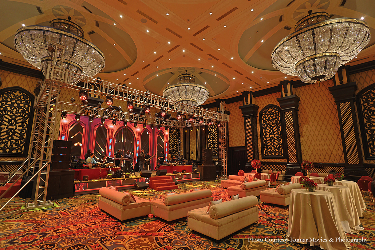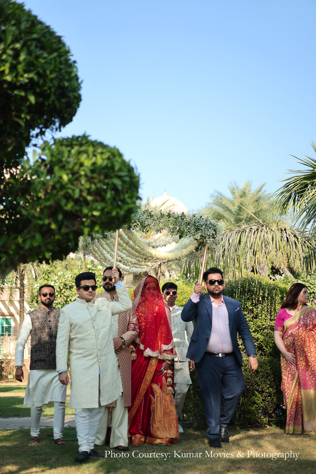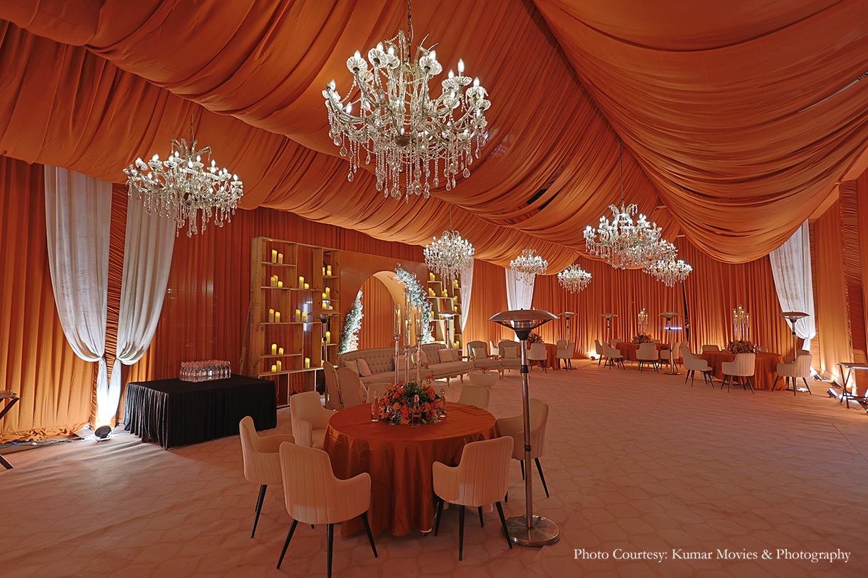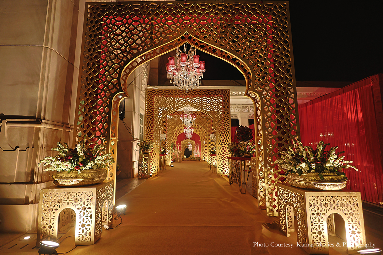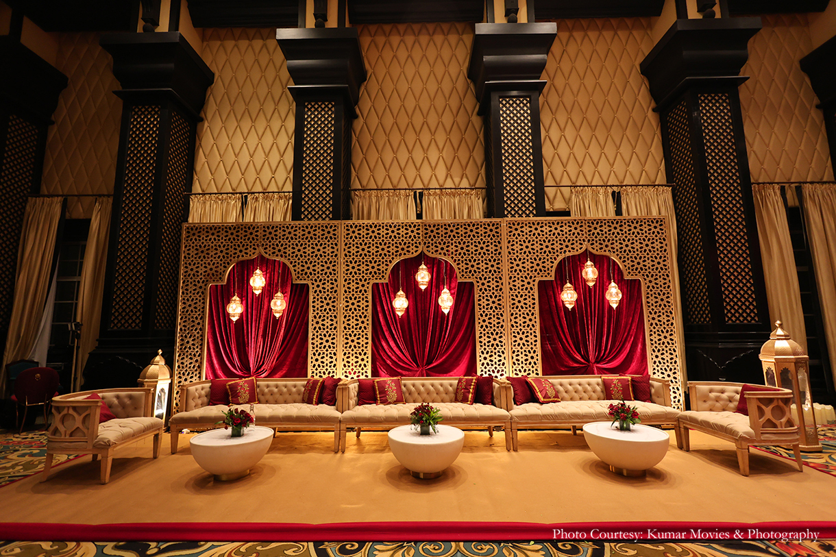 The sunlit wedding was followed by a Reception where the newlyweds had a gala time with their loved ones. Latticework arches, red drapes, multiple crystal chandeliers and comfy divans tied back to the ‘Sufi Night’ theme of the reception. A heartfelt ‘first dance’ had the couple waltzing on the dancefloor and later the guests raised a champagne toast to the couple’s good health.