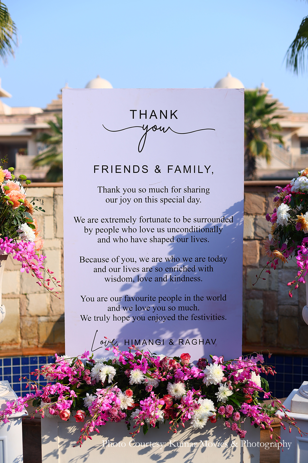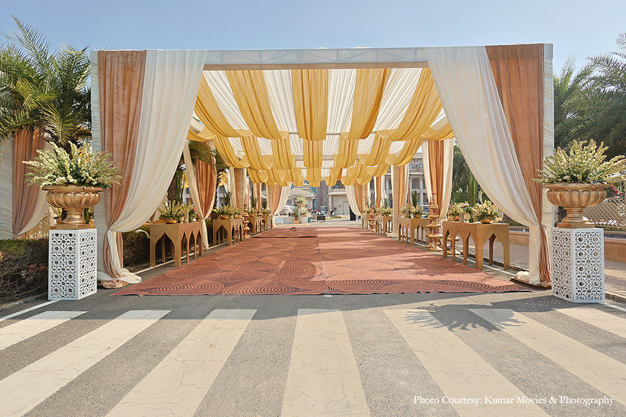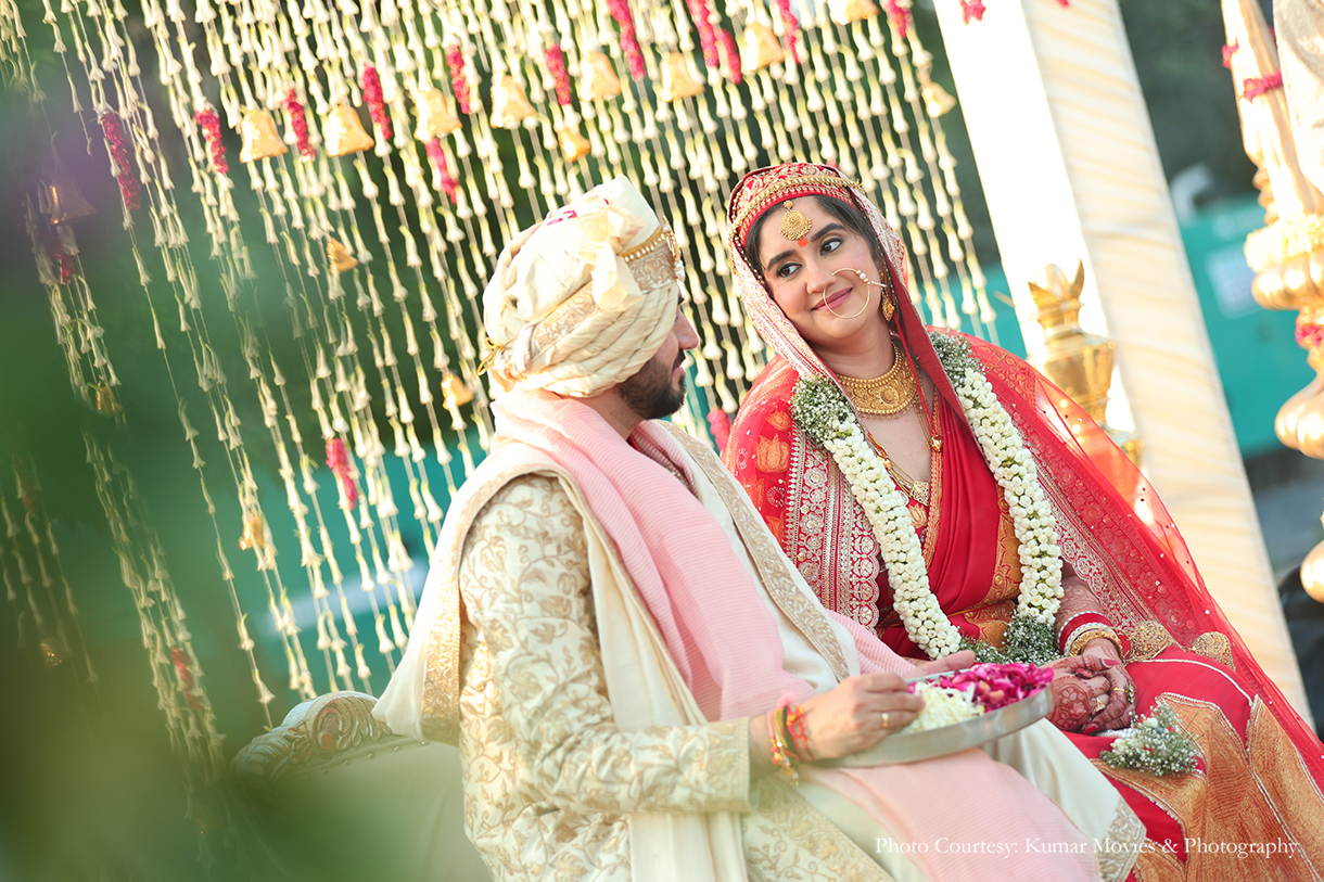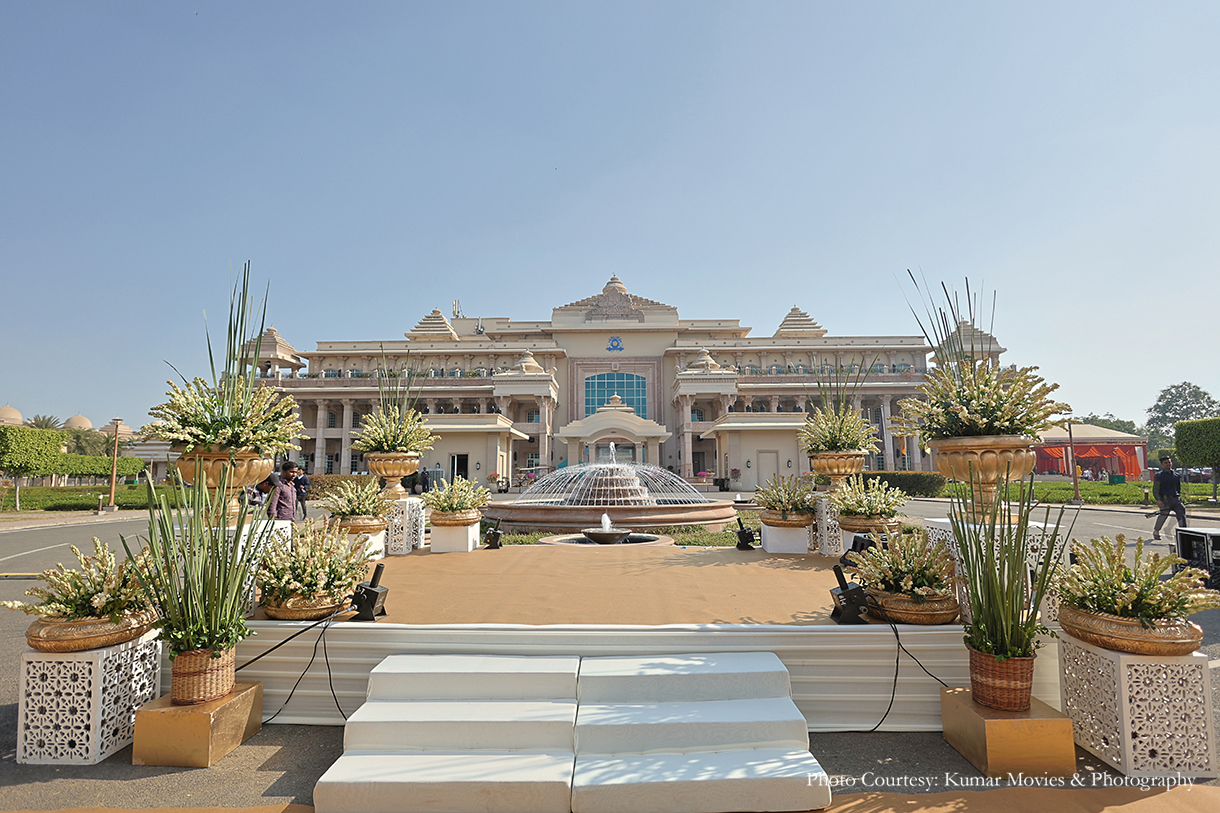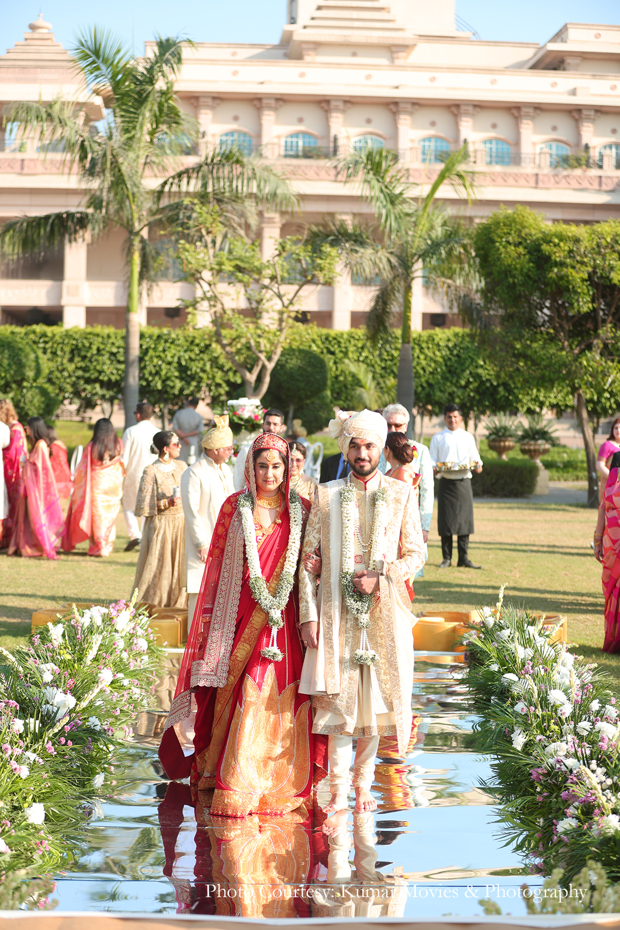Hosted on a sunlit morning on the Vrindavan & Firdaus Lawn in the venue, the wedding was picture-perfect. Adorned with white and pink blooms and a chrome aisle, the wedding fused subtle glam with the couple’s respective cultural elements. Himangi looked stunning as a Kashmiri Pandit bride donning a targah on her head along with a flowing dupatta. Pink and ivory hues adorned the venue striking a beautiful contrast with the lush greenery around it.