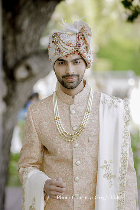 Both the bride and groom chose pastel hues for their attire. Himani donned an off-white embroidered lehenga with a pastel pink dupatta which she accessorized with pink floral jewelry. Rohit opted for a baby blue floral bandhgala with a white pocket square.