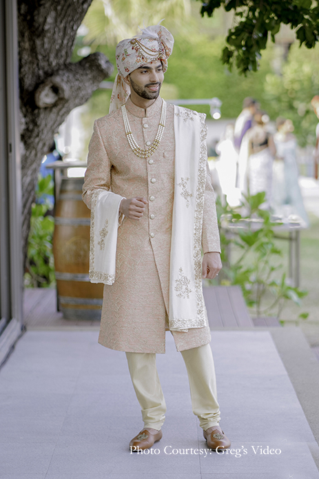 Held during dusk just as the sun gently dipped into the horizon, Himani and Rohit’s big day was held under the twilight sky which contrasted wonderfully with the delicate pink and white decor. The highlight of the occasion, however, was the mandap that overlooked the crashing waves and was replete with elegant flowers paired with a vintage chandelier that duly cast its golden glow over the couple.