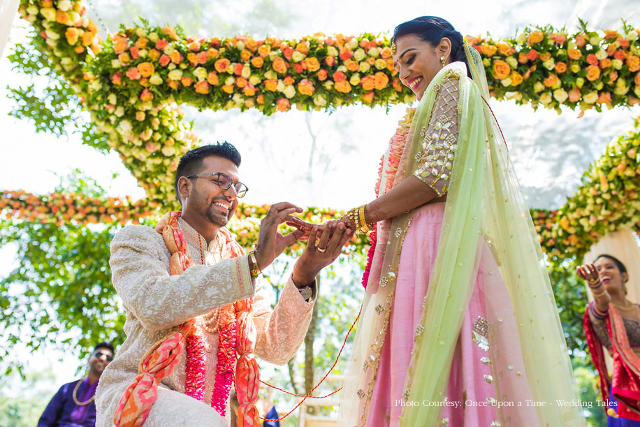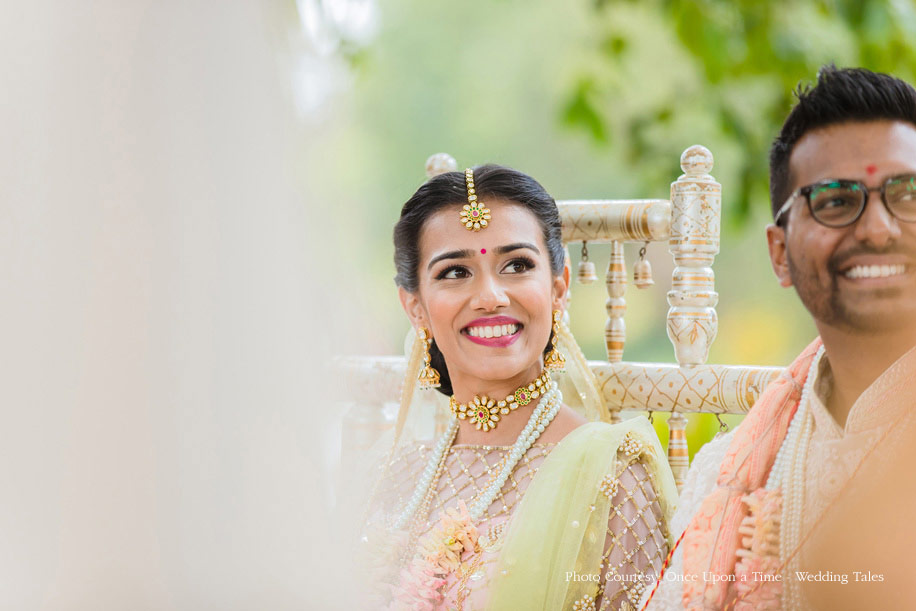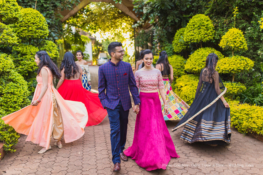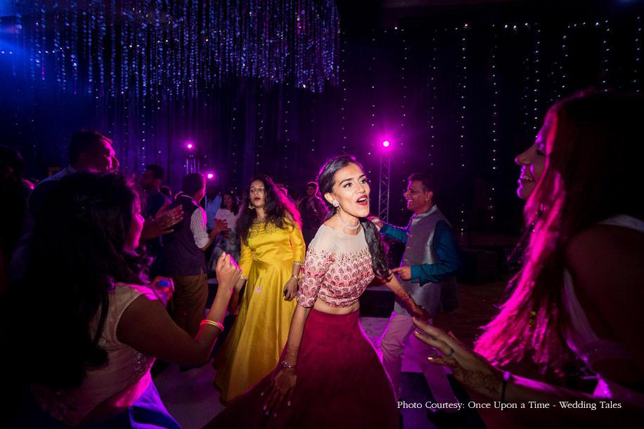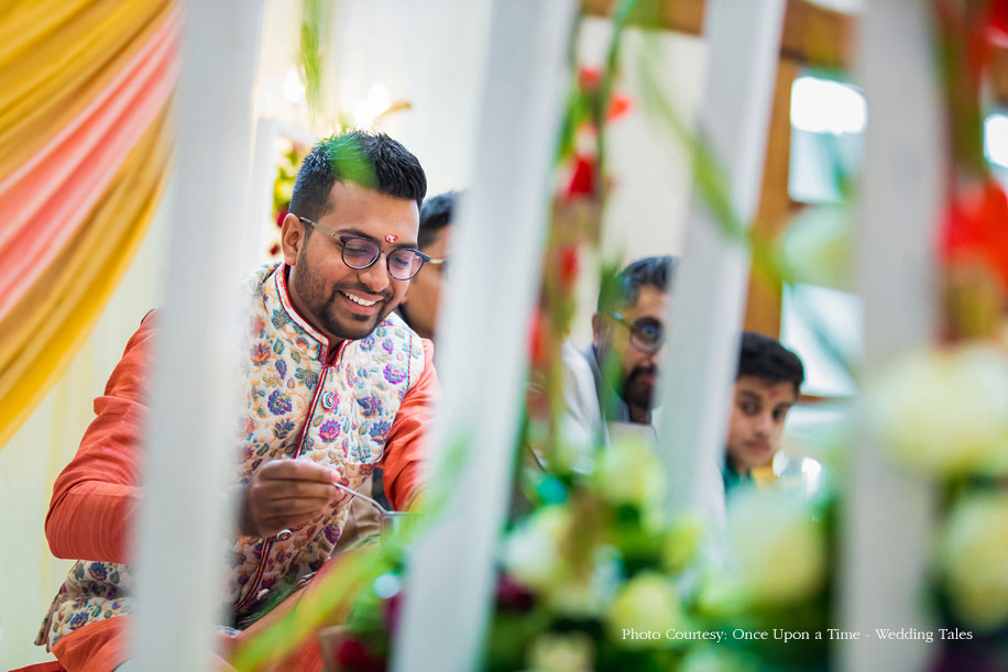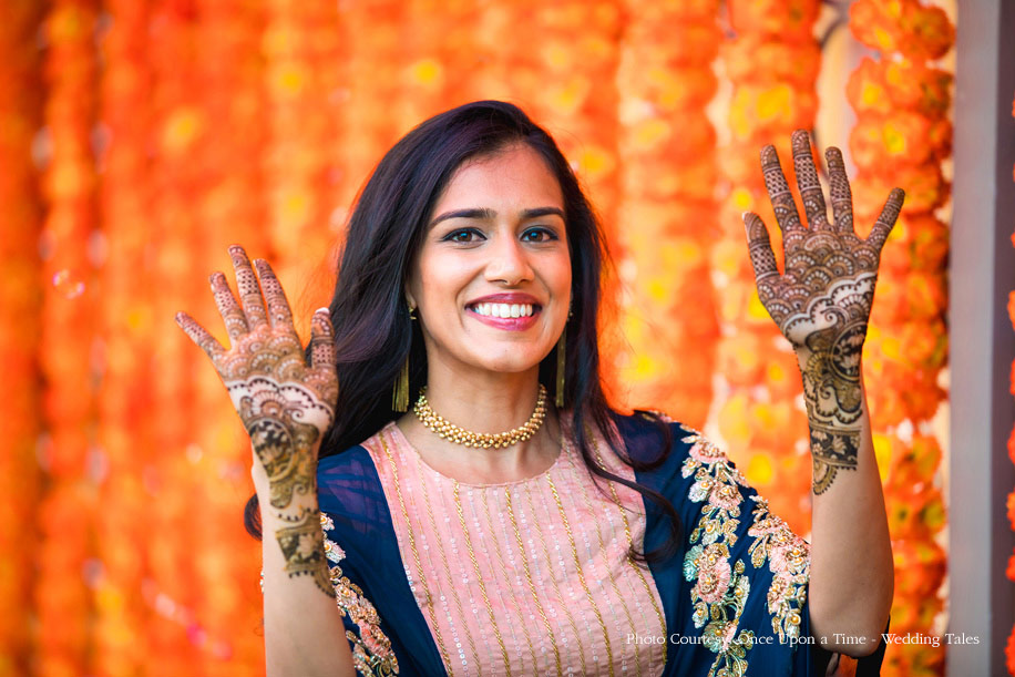 Hiral and Hansil’s wedding celebrations began with a mehndi that was buzzing with excitement. While drapes in vibrant colors set a happy tone, bright orange and yellow flowers added to the liveliness of the setup. The couple also planned a few games and activities for their guests to keep the cheer alive and keep everyone involved. The bride wore a beautiful peach outfit with a blue cape while the groom wore a golden bandi and a printed shirt with a pair of jeans.