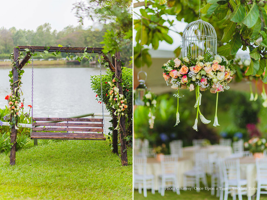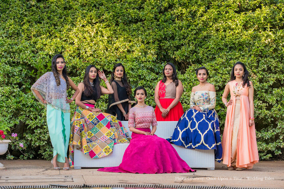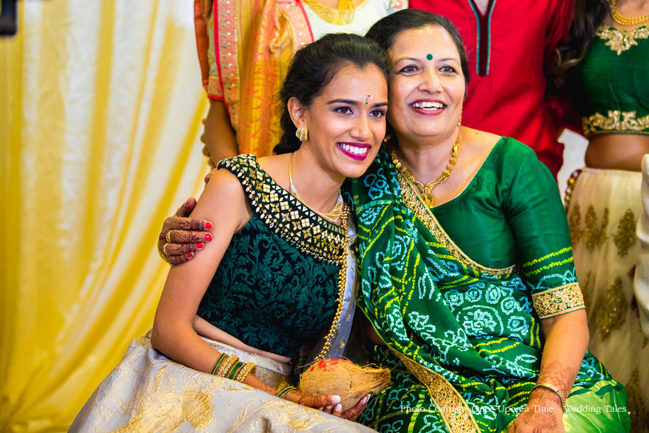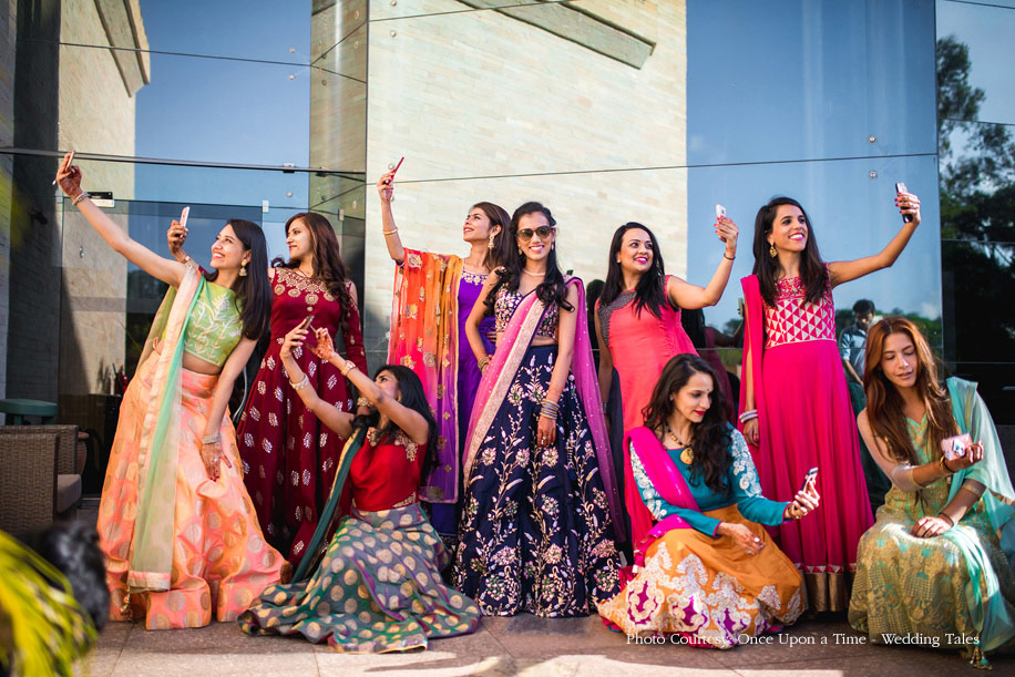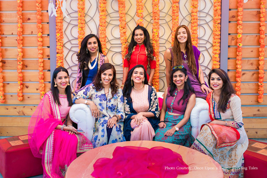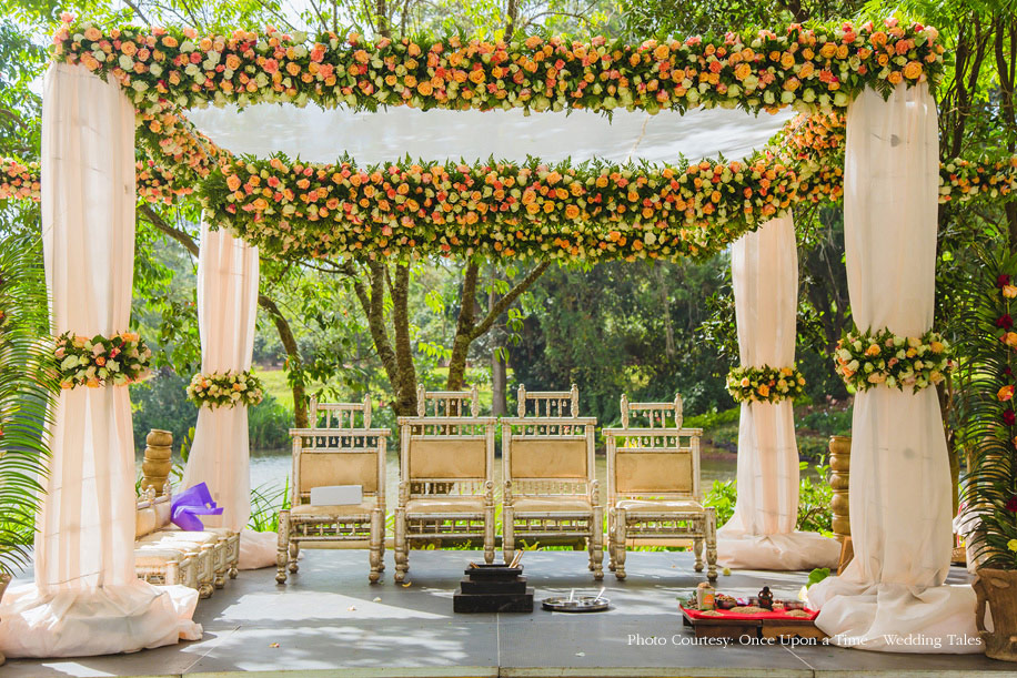 Hiral and Hansil’s wedding celebrations began with a mehndi that was buzzing with excitement. While drapes in vibrant colors set a happy tone, bright orange and yellow flowers added to the liveliness of the setup. The couple also planned a few games and activities for their guests to keep the cheer alive and keep everyone involved. The bride wore a beautiful peach outfit with a blue cape while the groom wore a golden bandi and a printed shirt with a pair of jeans.