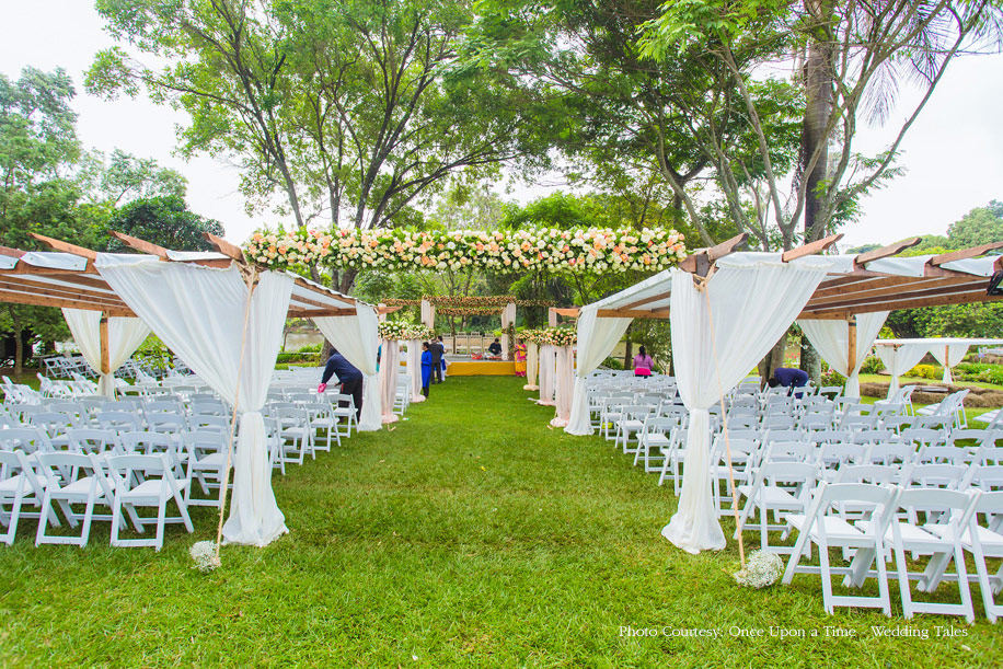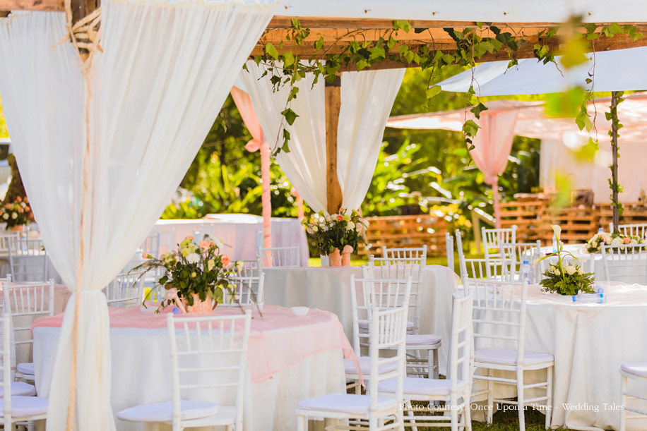 The couple wed in an outdoor ceremony the following morning. The lawn saw a barn style set up with haystacks covered in cloth which made for the some of the seating. Keeping in line with the white and pastel color story of the rest of the setup, the mandap was decorated with white drapes and pastel flowers. The bride wore a light pink and mint green ensemble while the groom complemented her outfit in a white sherwani.
