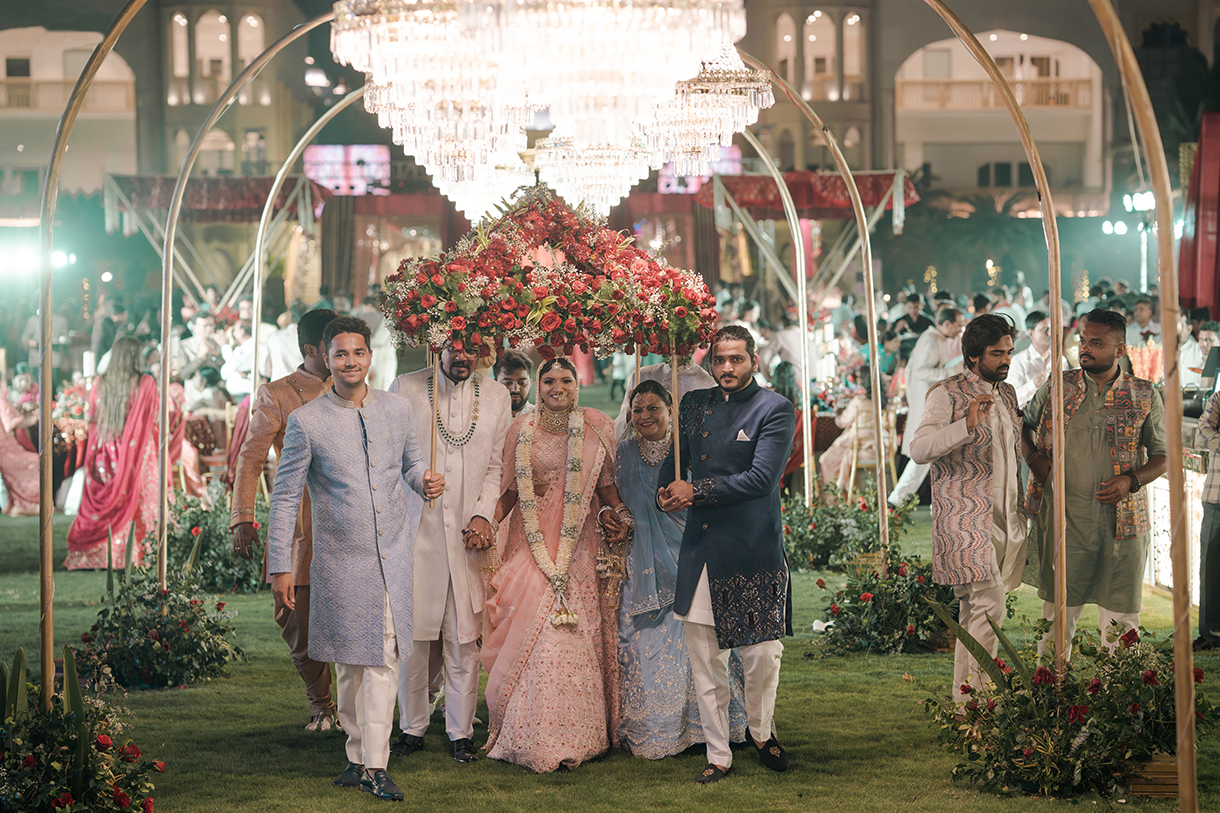 Grandeur was given a solid leg-up as the couple geared up for their pheras. Scarlet drapes, roses and ivory pillar candles adorned the outdoor venue. Plush red velvets covered gilded chairs where the guests were seated to keep them comfy. A carefully choreographed ‘Ram Sita’ themed varmala ceremony made jaws drop while the pastel-themed dress code paved the way for picture-perfect moments.