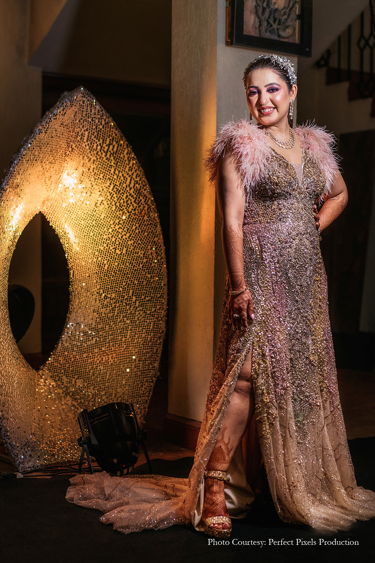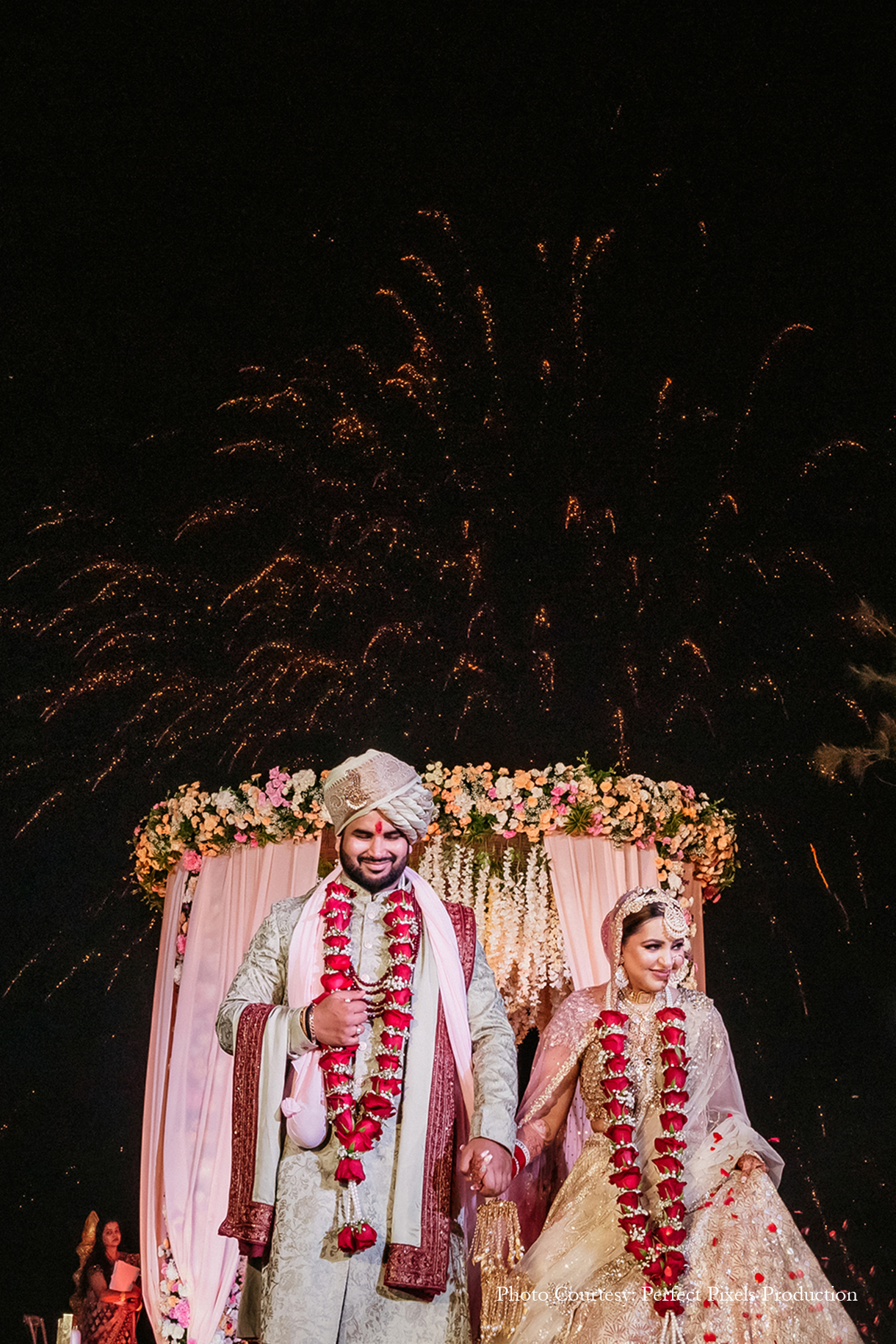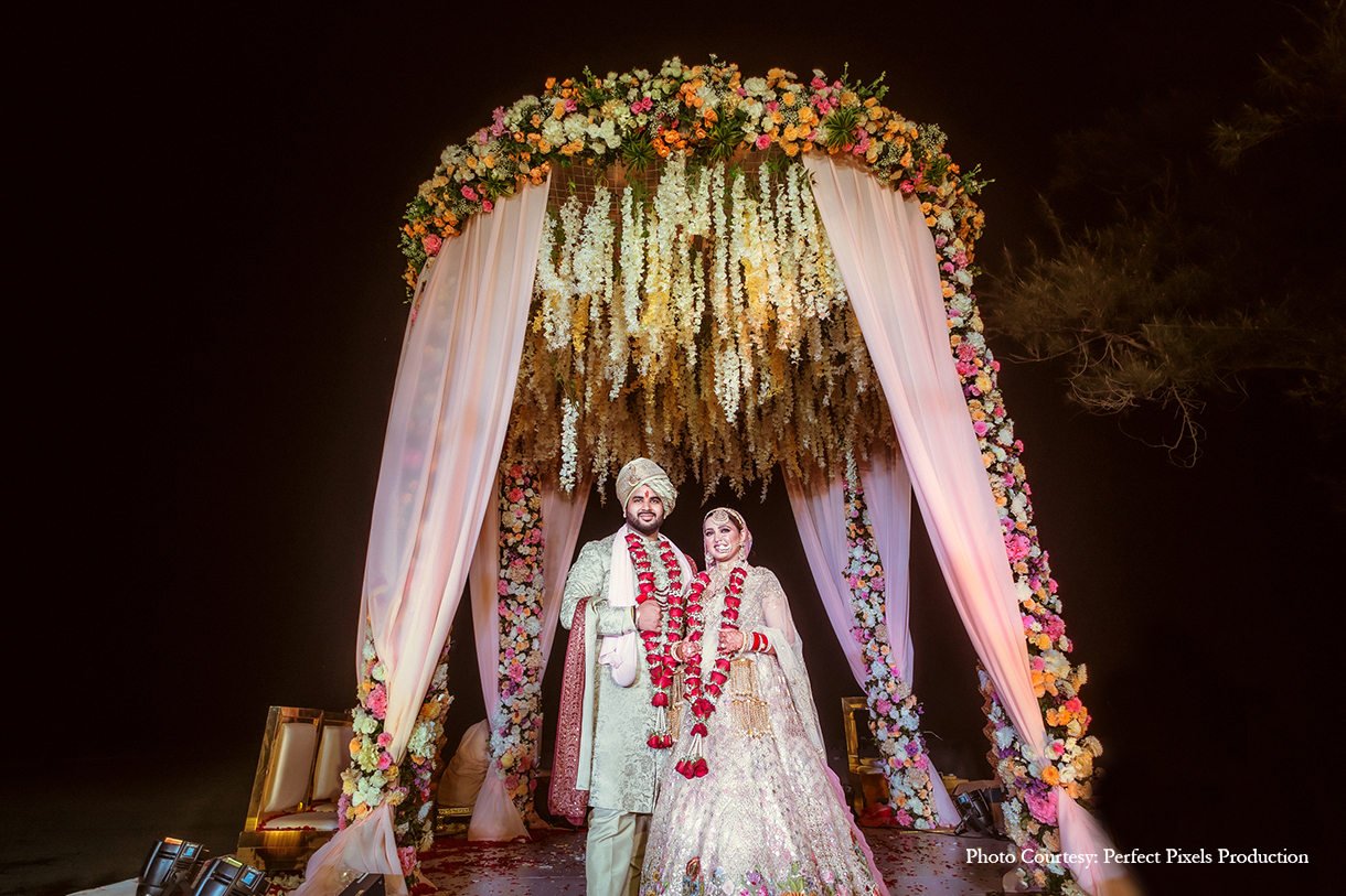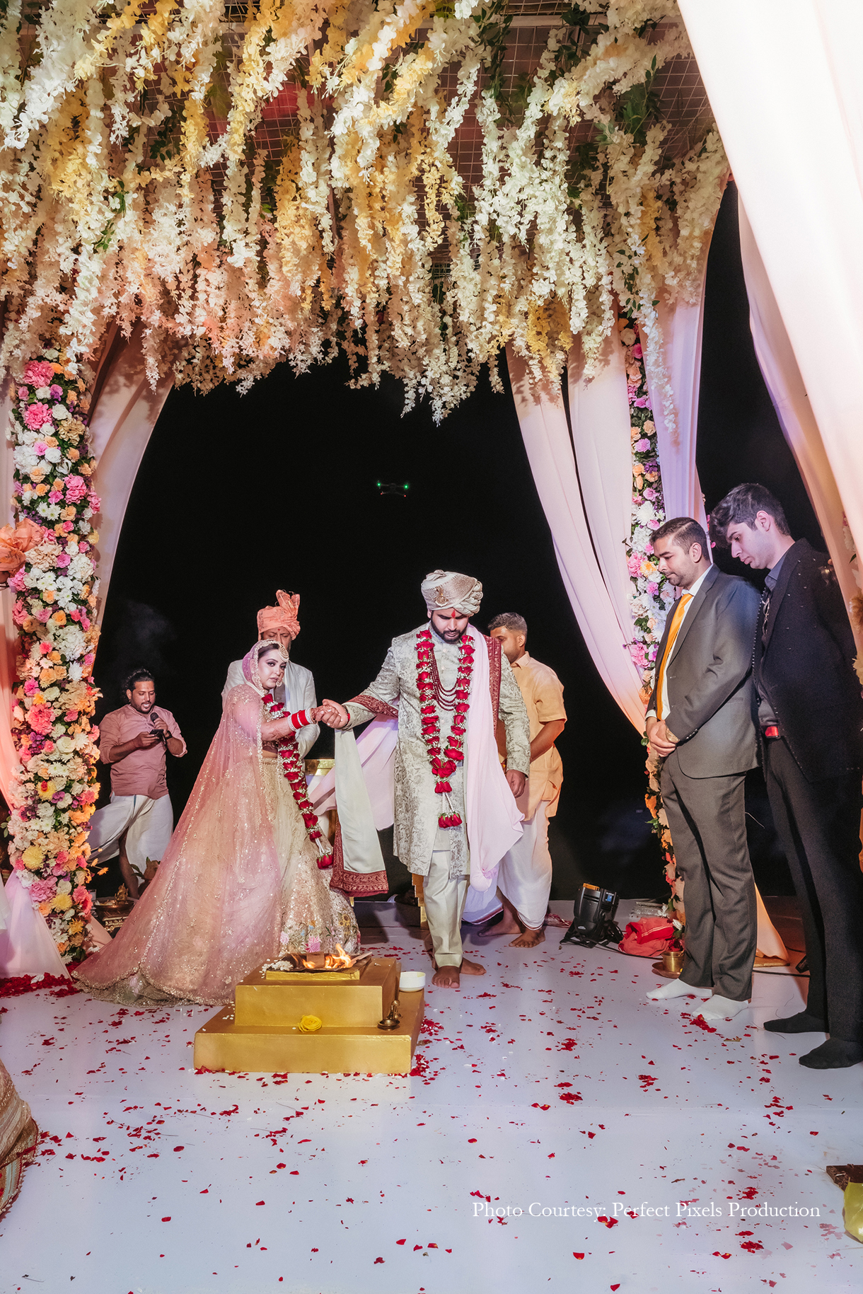 Hosted by the beach, the circular mandap looked dreamy against the sunset sky. With suspended blooms and a rosy pink color palette, the mandap exuded a dash of glamour as Ishita walked down the chrome aisle. After the phere, the couple’s first moments as newlyweds were celebrated with fireworks. The wedding was followed by a reception where the couple and their loved ones danced the night away under the stars.