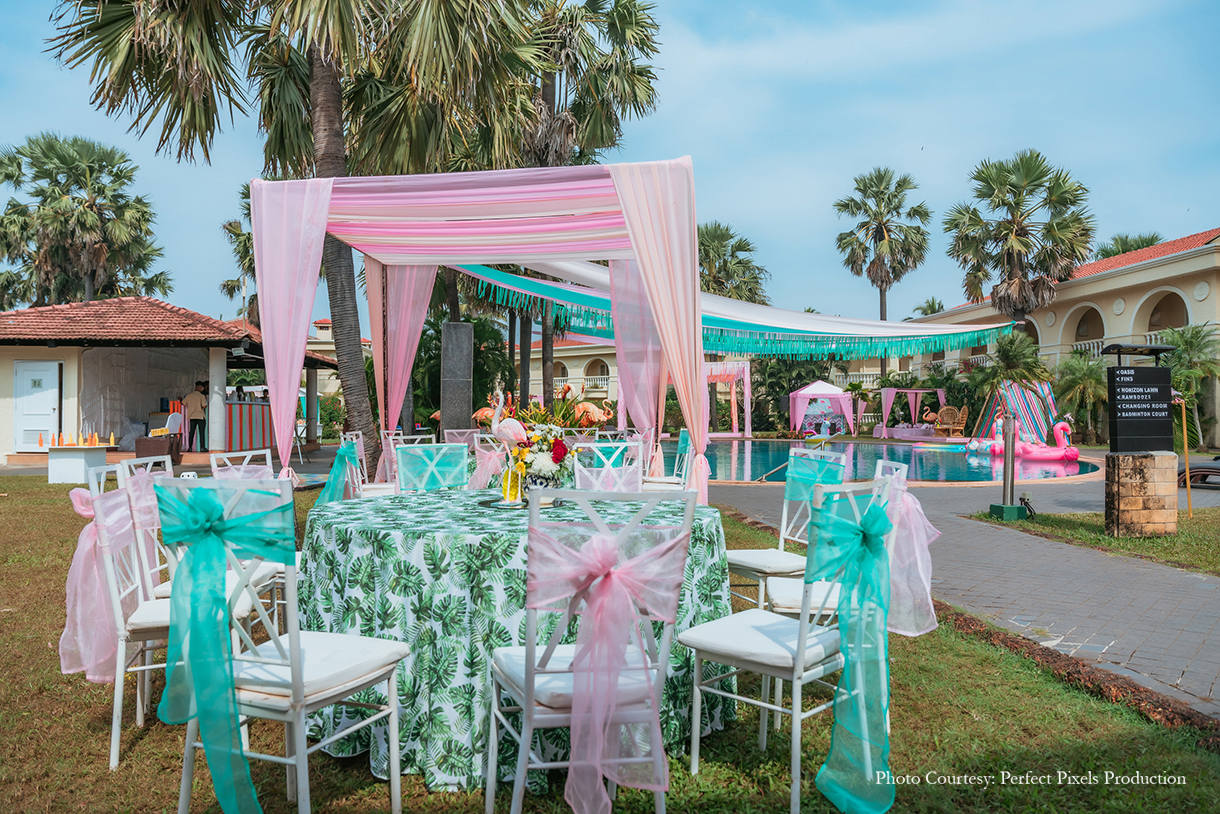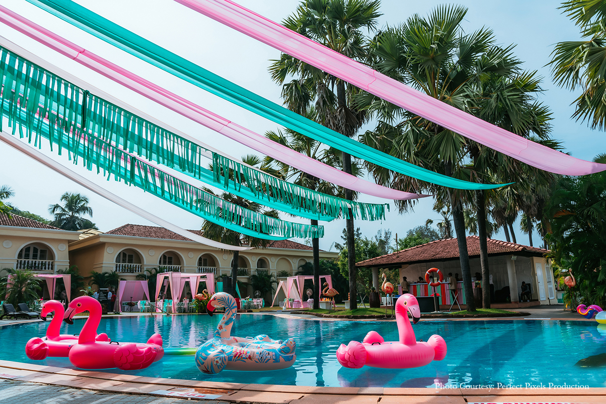 Flaunting a tropical theme with purple and pink hues paired with tropical foliage, the pool party witnessed everyone letting their hair down as they enjoyed the sunny day to the fullest. Floating pink flamingos, artistic cane chairs, festooned teepees and larger-than-life board games added to the breezy ambience.
