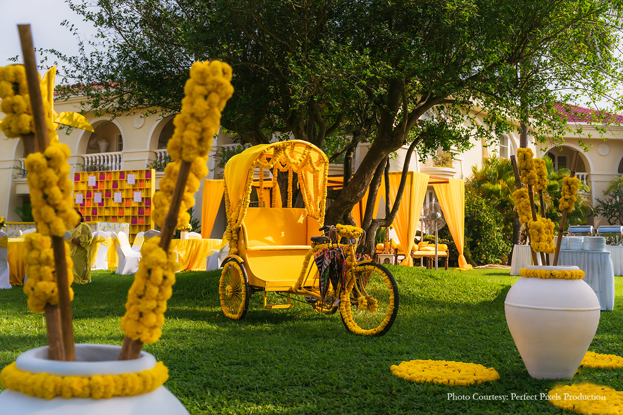 Contrasting beautifully with the bright blue sky, the haldi decor consisted of cheery yellow canopies that flowed in the breeze with white furnishings. Accentuating these hues were pops of green that were strategically placed across the venue.