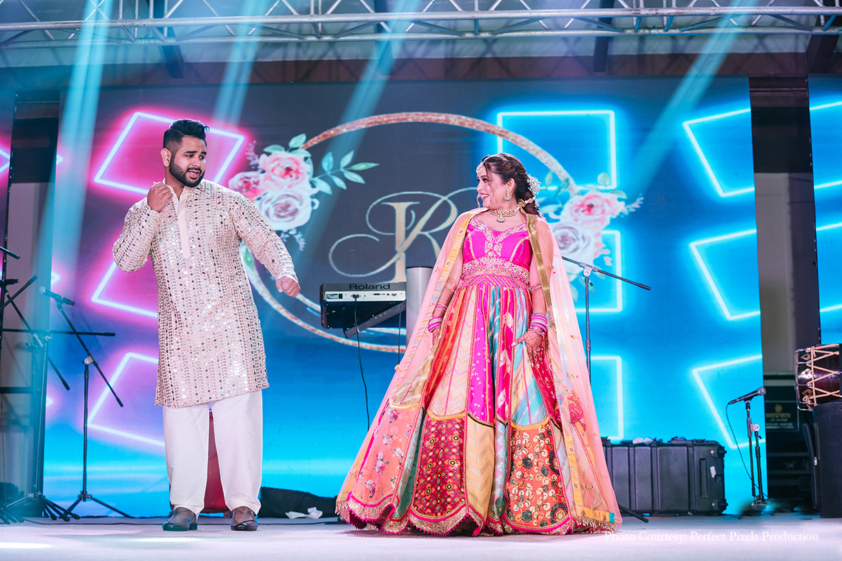 After the Bollywood-inspired welcome party, the sangeet took a more traditional route with floral garlands and plenty of lights. Hosted indoors, the decor consisted of a huge stage backed by LED screens. As the families put their best foot forward onstage, the couple cheered them on!
