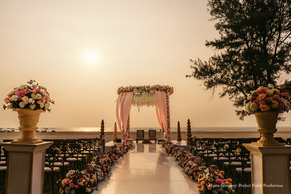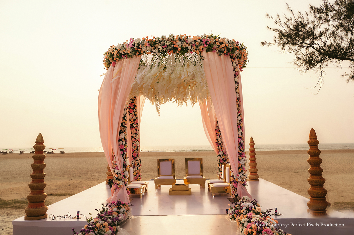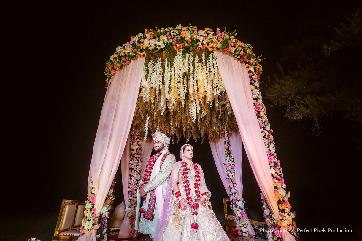 Flanked by the dramatic sunset sky this couple’s destination wedding mandap was a serene one with a variety of pink and lavender hues.