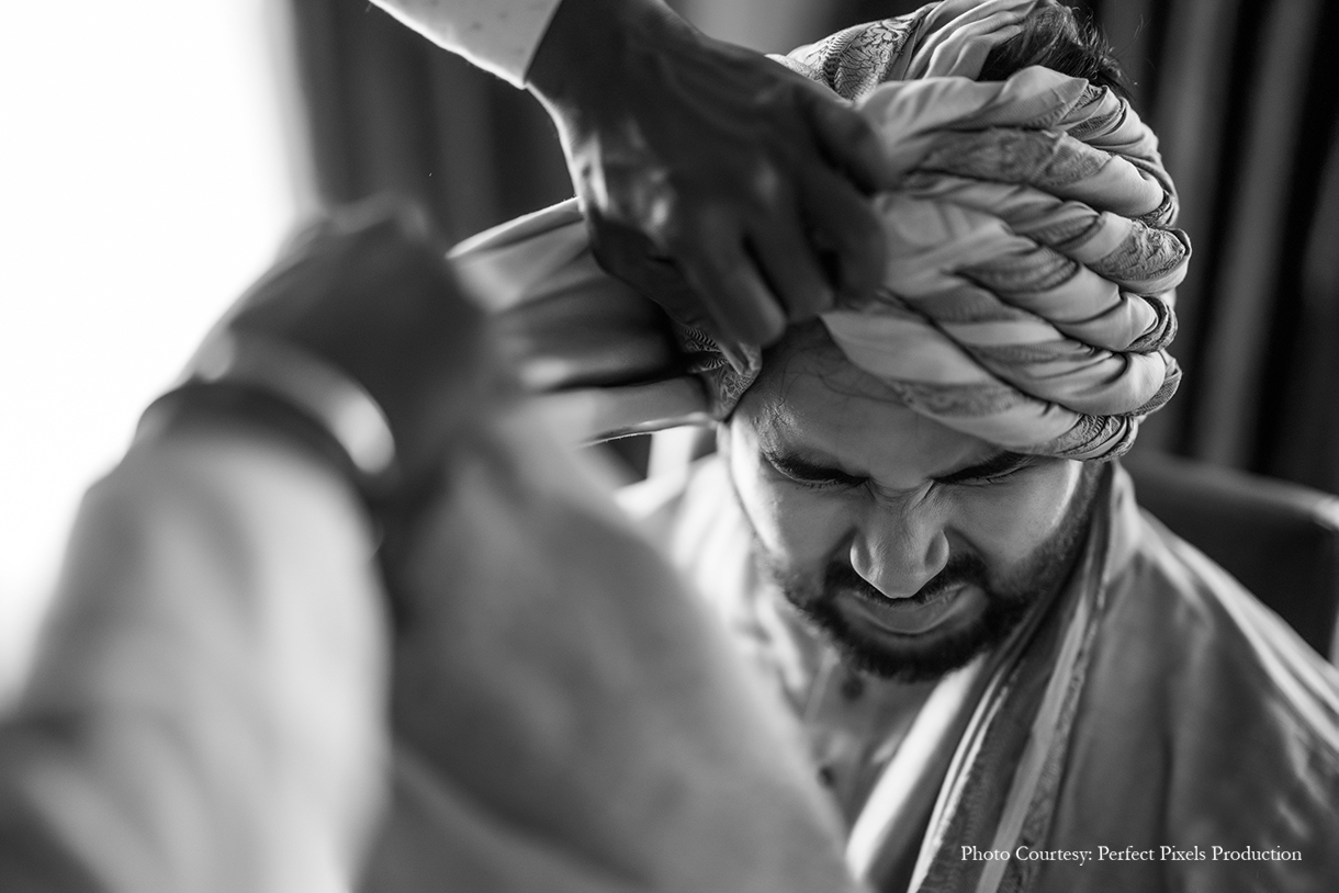 Groom’s Outfits: Motif by Uday Mahajan (Welcome Dinner, Haldi), Versace (Pool Party), Mayank Chawla (Sangeet), Punit Arora (Wedding)