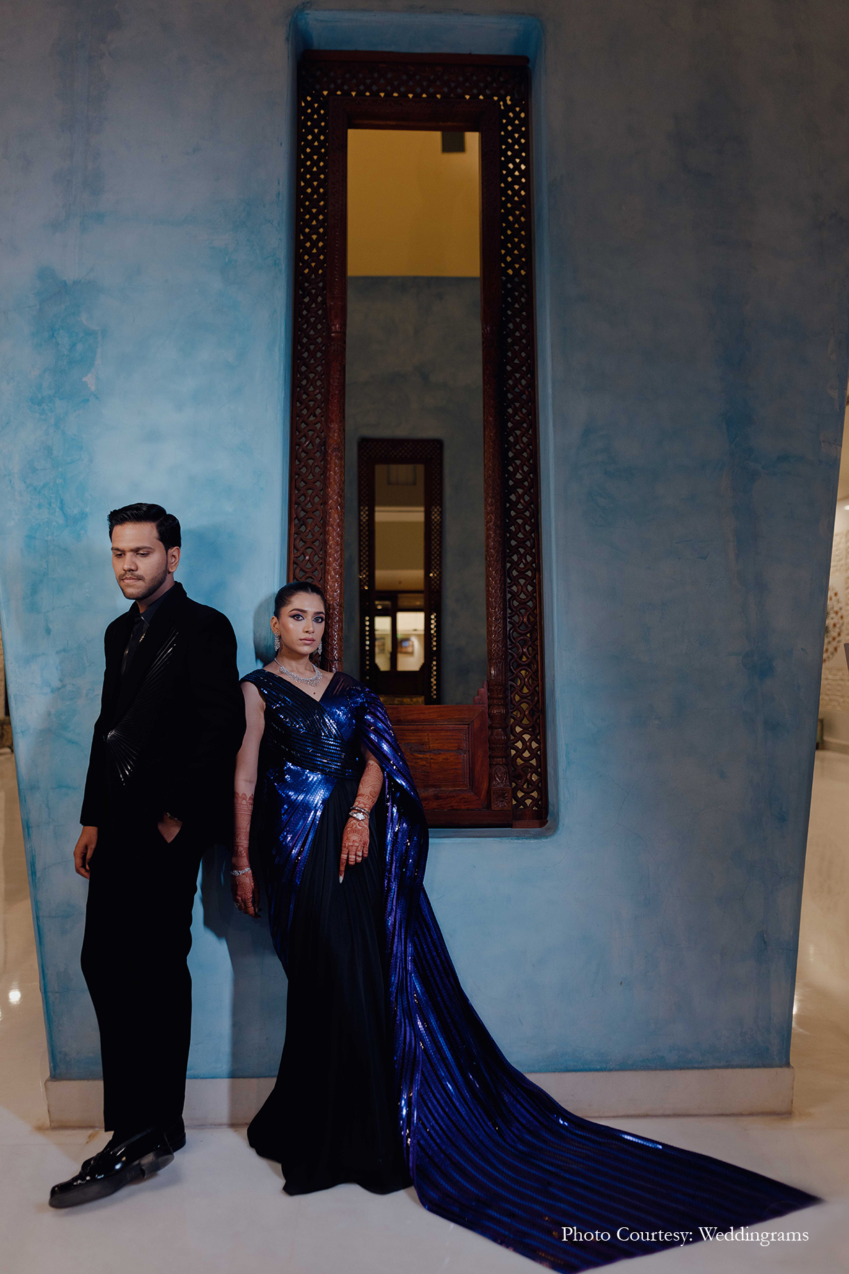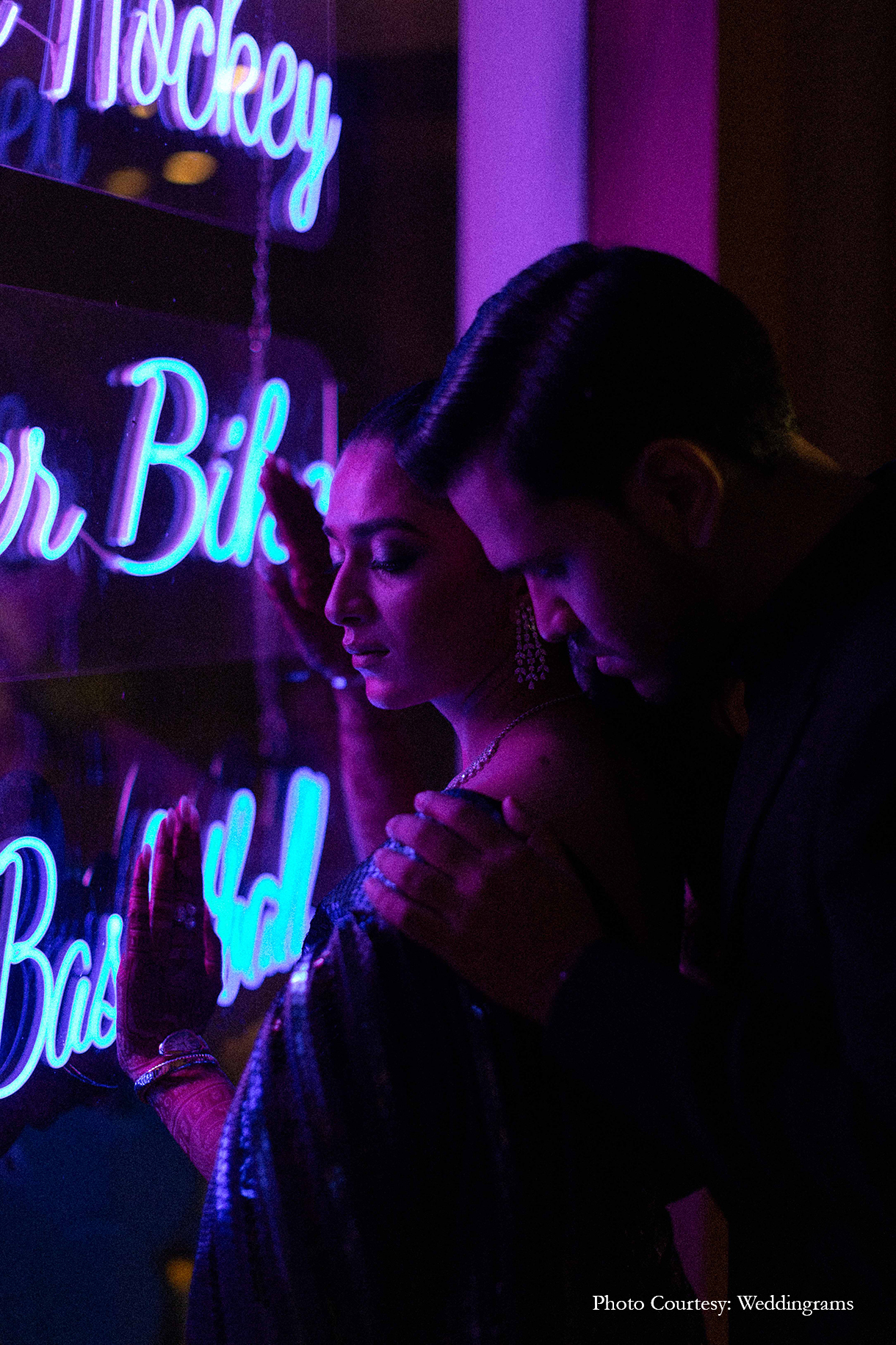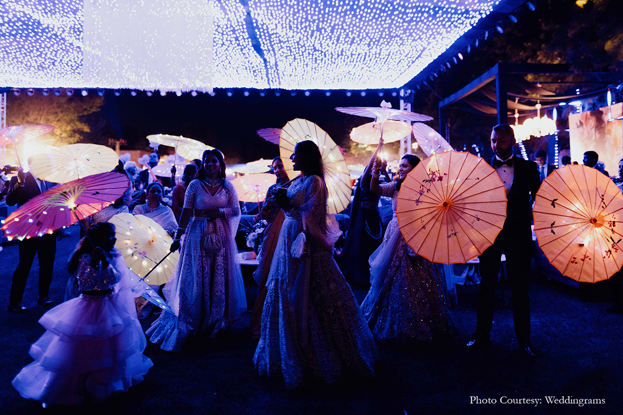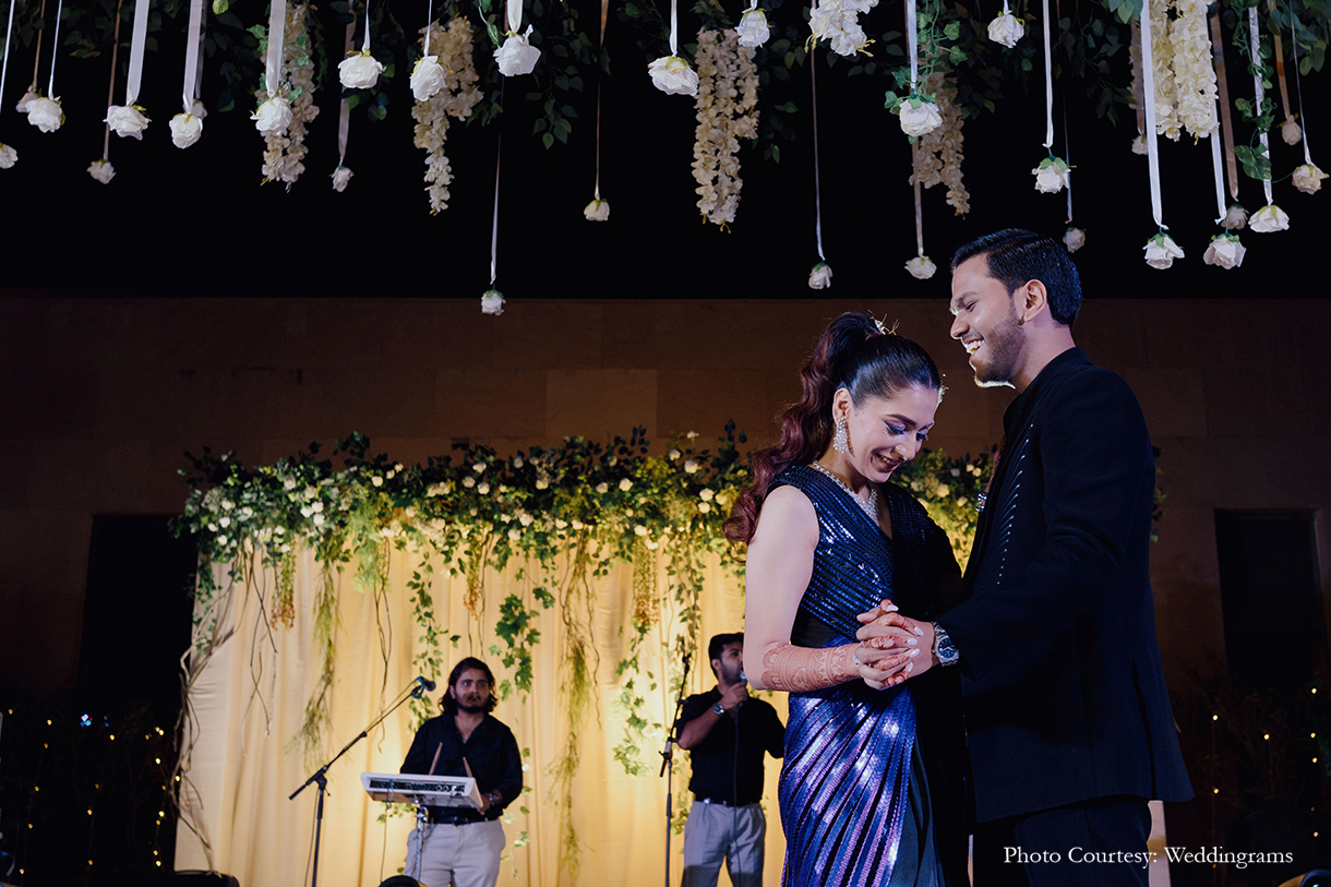 The celebrations commenced with an elegant Welcome dinner, where the groom donned a sophisticated black suit, while the bride dazzled in a midnight blue shimmer saree. The evening was adorned with striking neon decor and accompanied by live music, as the couple gracefully danced beneath a breathtaking canopy of flowers and lush foliage.