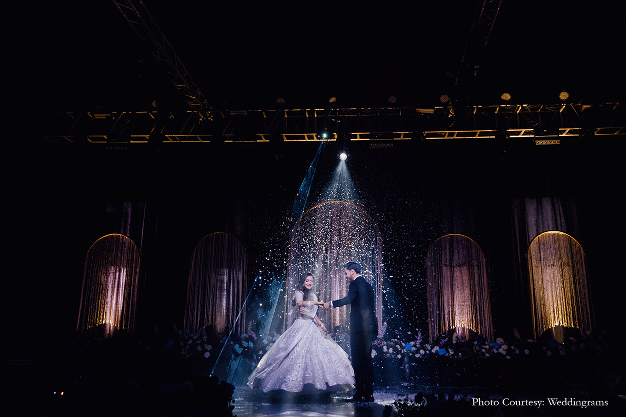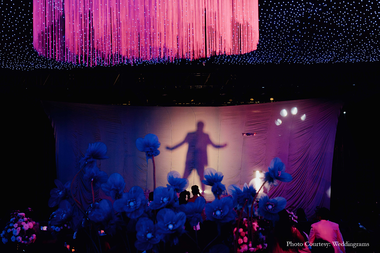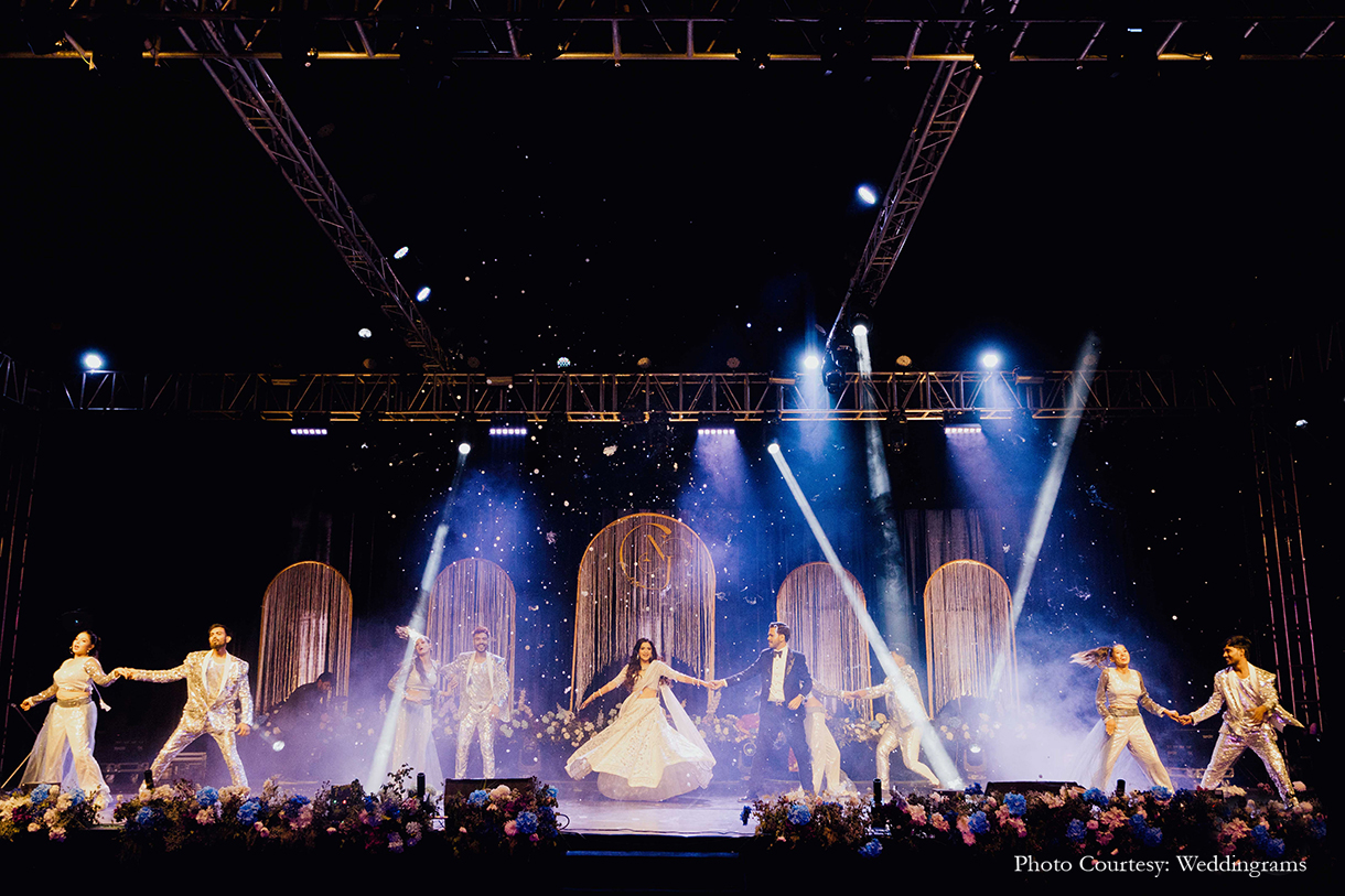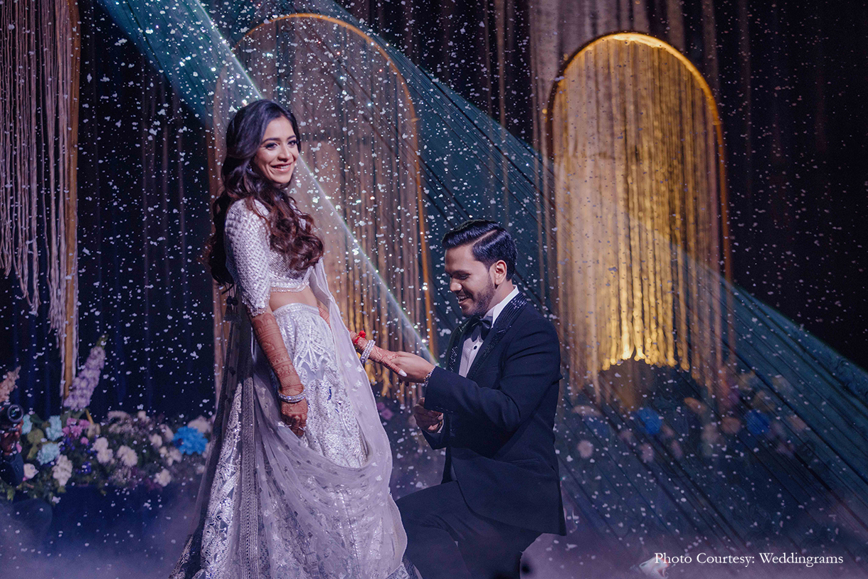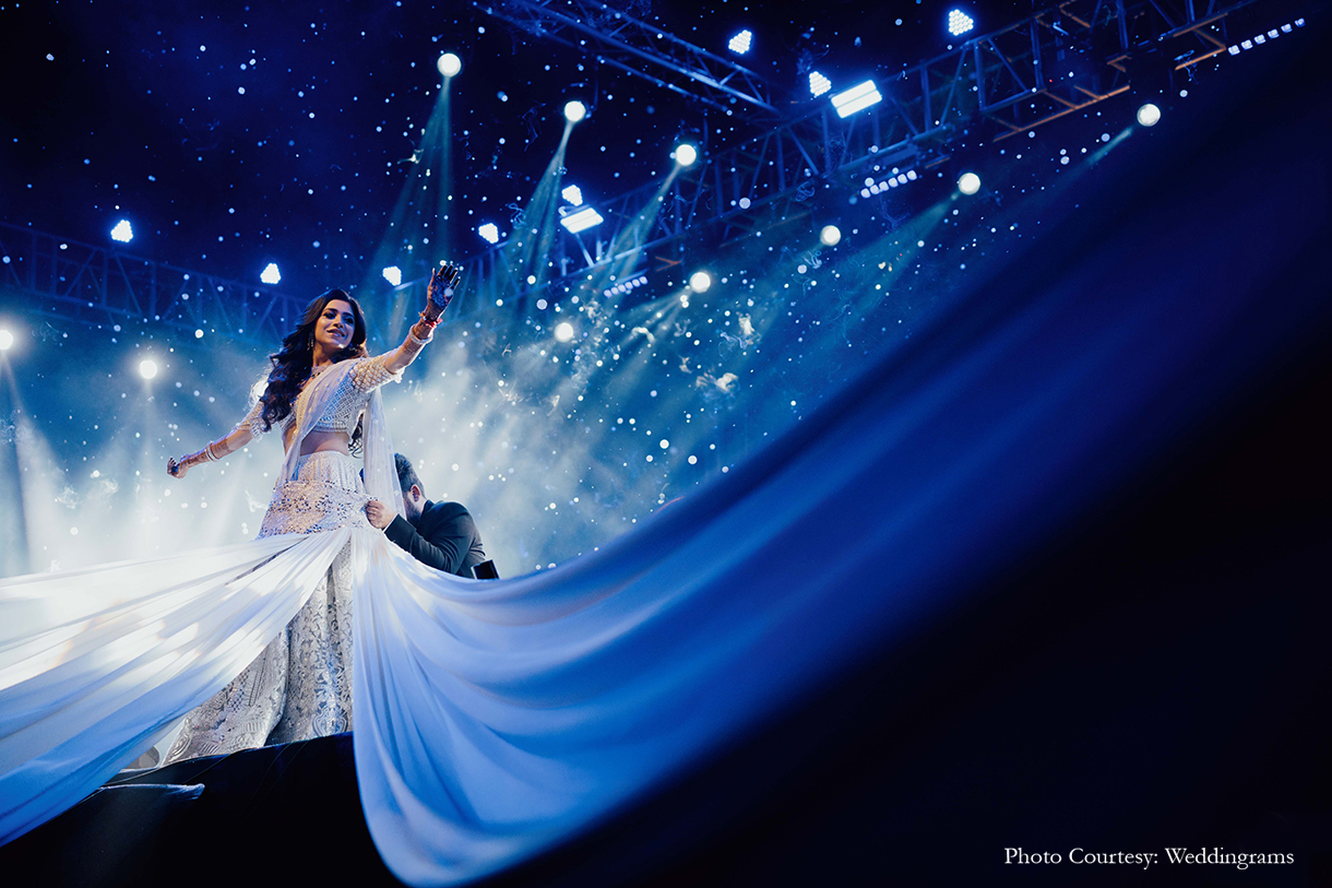 The Sangeet night unfolded with a celestial theme, adorned with a dreamy blue palette and vibrant fresh blooms, including magnificent 3D floral creations. In a magical moment, the groom knelt amidst a veil of mist on the floral stage, delicately placing the ring on the bride’s finger as a spotlight illuminated their love, culminating in their first dance surrounded by a dazzling display of fireworks. The evening continued with breathtaking performances from friends and family, creating an unforgettable celebration.
