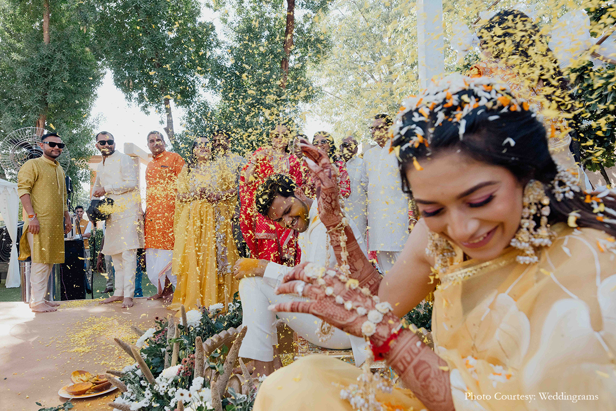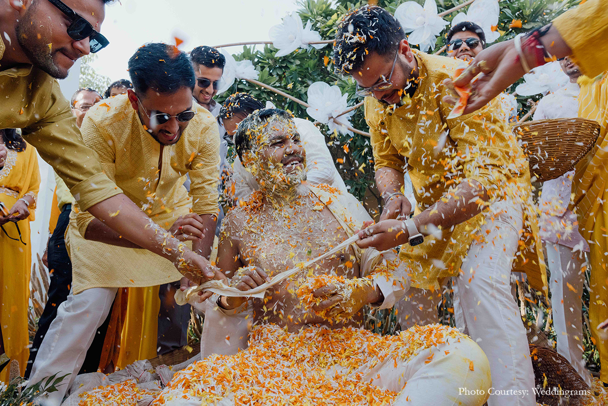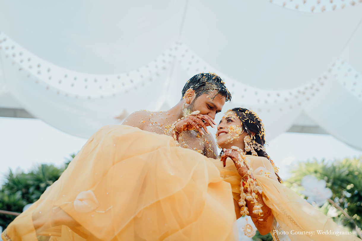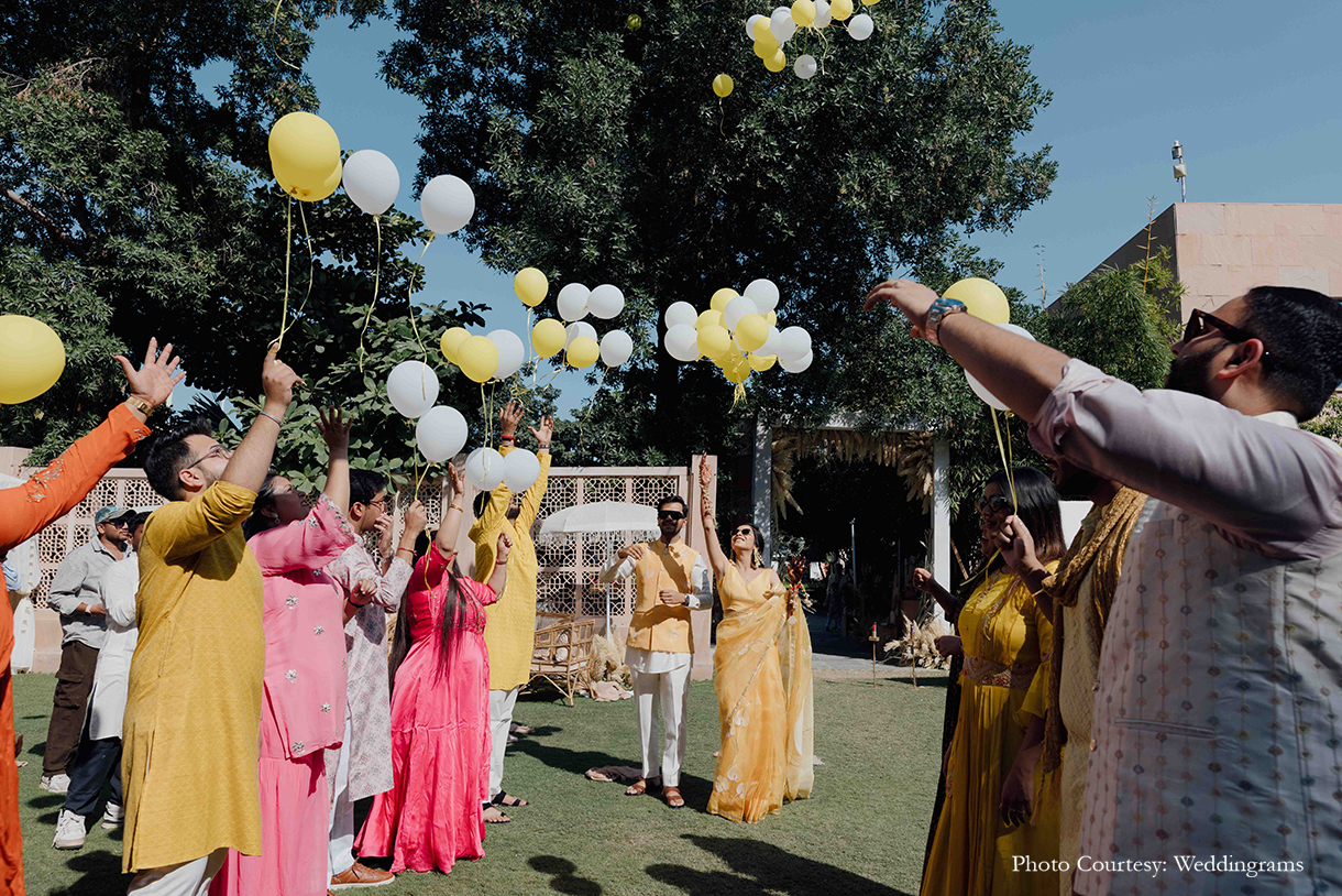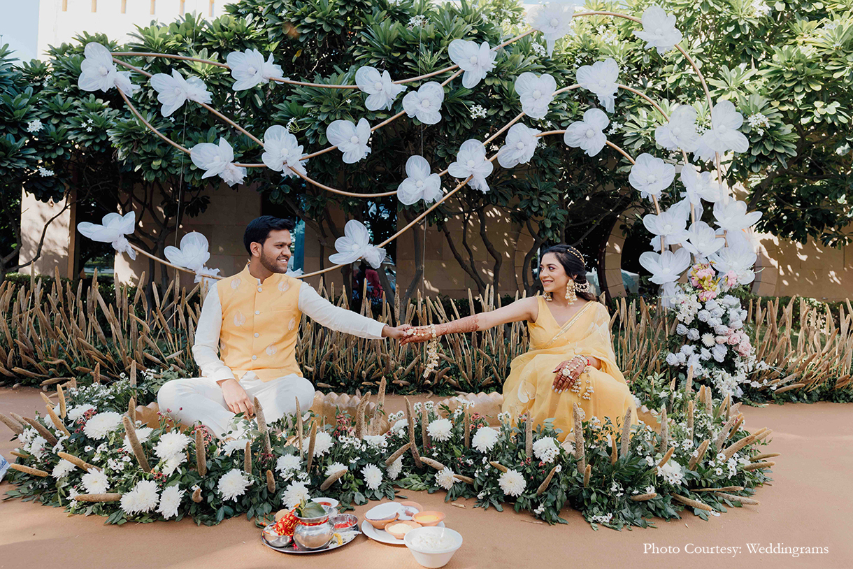 The following morning unfolded with an enchanting Haldi ceremony, where the bride looked radiant in a beautifully handpainted saree. As the couple made their entrance, friends gracefully lifted balloons on either side, setting a joyous atmosphere. The chic decor featured an array of white blossoms, flowing drapes, lush foliage, and dried millets. Seated in exquisite brass urlis adorned with flowers, the couple was anointed with turmeric paste by their loved ones.