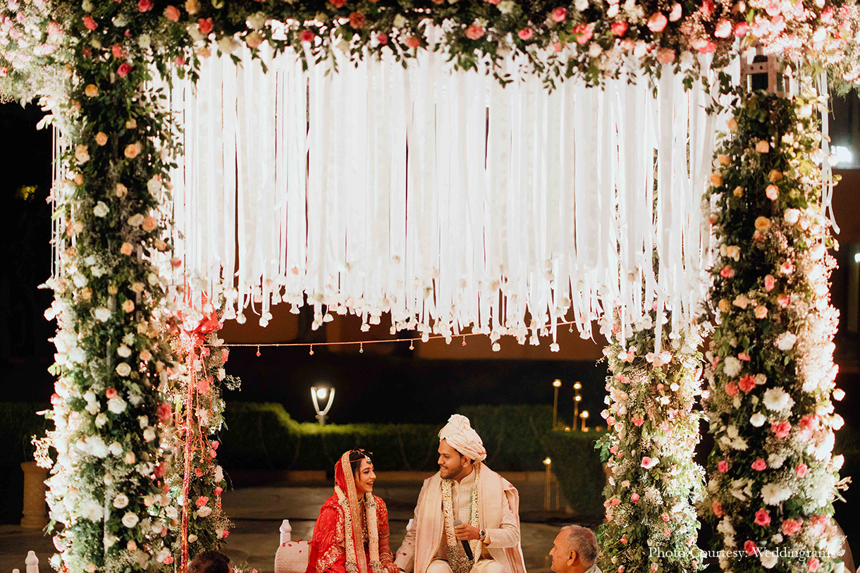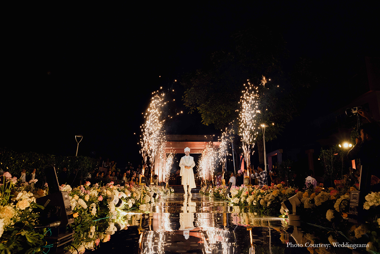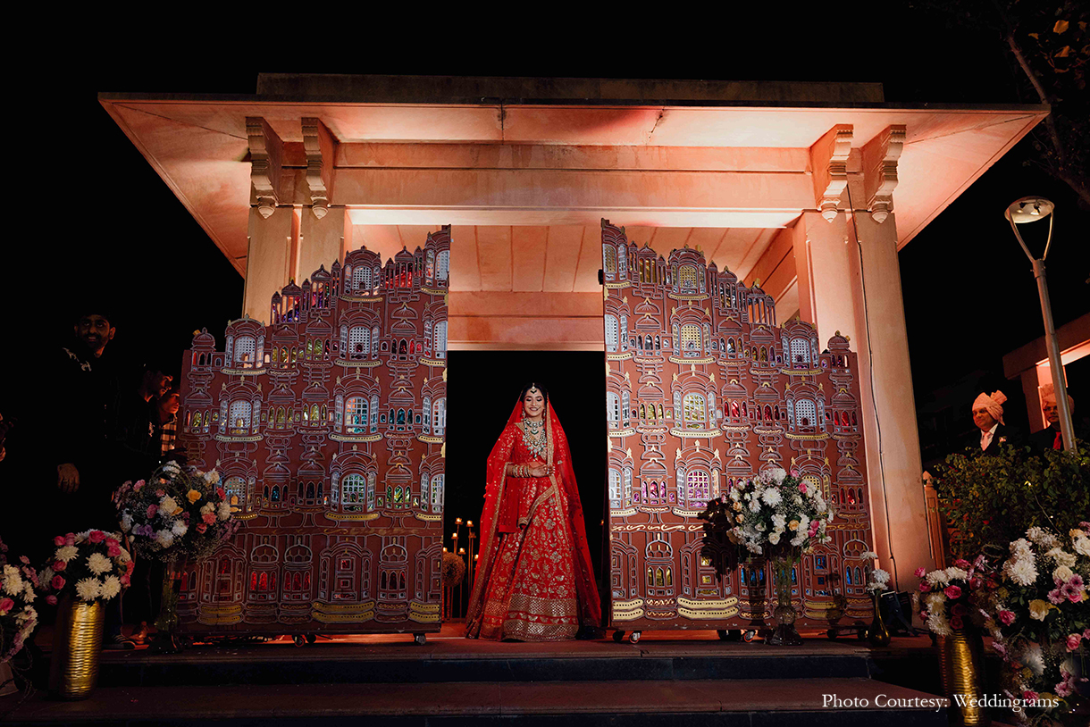 The Wedding ceremony unfolded like a floral fantasy. Adorned in a regal ivory sherwani, the groom waited for the bride at the end of a mirrored aisle adorned with blossoms. At the other end of the aisle, an exquisitely designed facade of the Hawa Mahal parted opened, revealing the bride in breathtaking splendor. Surrounded by a dazzling display of sparklers and fireworks, the couple exchanged varmalas and pledged their vows beneath an enchanting floral mandap.