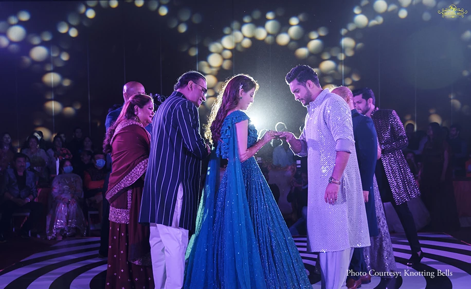 Commencing with the bride and groom exchanging rings while their families cheered them on, the sangeet was off to a joyful start. With Bollywood’s musical legends like Kumar Sanu, Sonu Nigam, and Anu Malik giving stellar performances, the guests were treated to an enchanting night filled with music and dance. The bride’s squad also had model and fashion influencer Sakshi Sindwani who set the stage on fire as they performed to their favorite tracks.