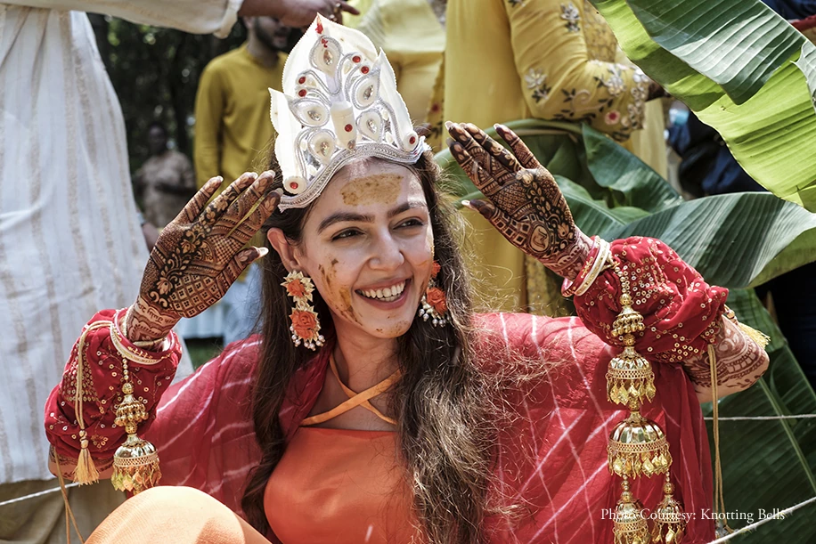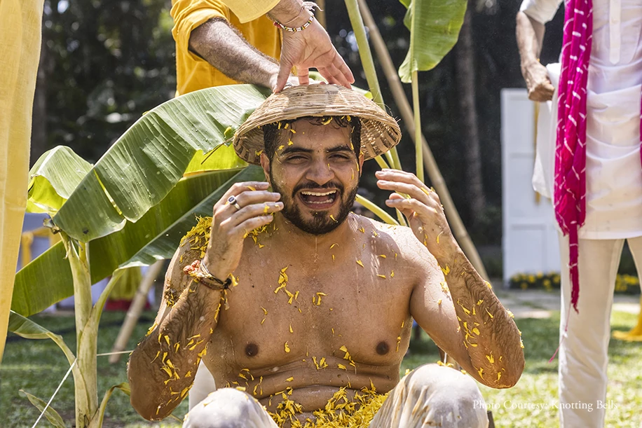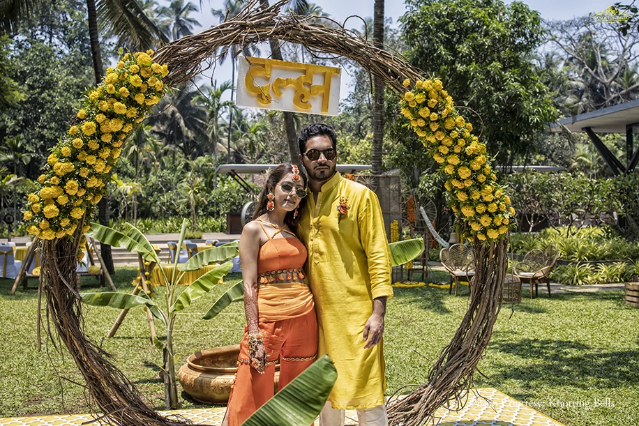 Decorated with rustic as well as traditional elements, the Haldi followed both Bengali and Sindhi traditions. Peppered with bright marigolds, banana leaves and comfy cane furniture, this event witnessed everyone at their playful best.