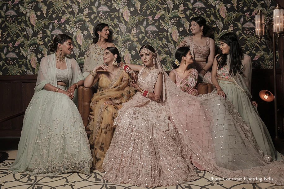 Hosted under a starry blanket in the sky and lit up by the glow of delicate fairy lights, the wedding looked straight out of a storybook with its minimalistic decor. A stunner in her pale pink and silver embroidered lehenga, Meghna looked radiant as she posed with her gal pals while Jai complemented her in an off-white sherwani.