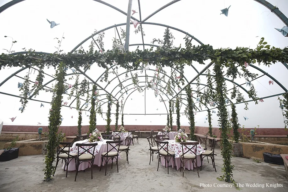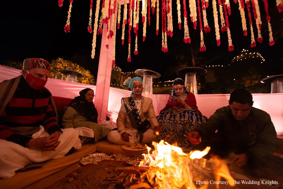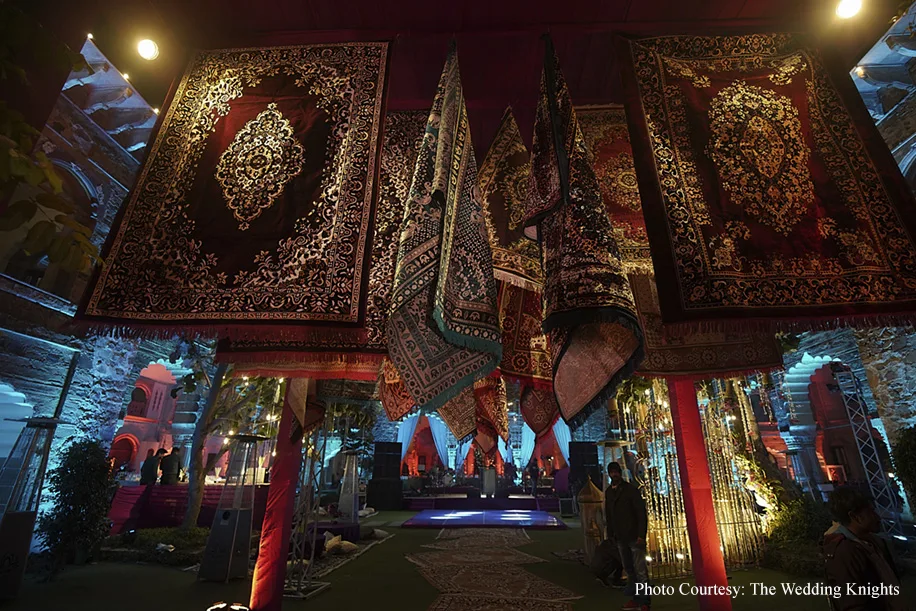 With their roots in Kashmir, the bride and groom wanted a modern yet royal wedding that celebrated their Kashmiri heritage while also highlighting their personal styles, and so they entrusted Weddings by Event Crafter to action it out. From finding the perfect venue at Neemrana’s Tijara Fort-Palace to planning and executing every last detail, they handled it all. Talking about their experience, they share, “It was a blessing to have an amazing wedding planning team. They picked the dreamiest venue for our traditional Kashmiri wedding of 3 days and multiple functions. Every function had a different theme ranging from boho to Arabic, ecofriendly origami-themed decor and a tie-and-dye Rajasthani theme respectively, but all maintained the Kashmiri ethos.
