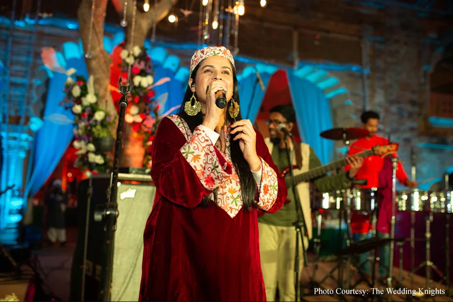 Starting the festivities with a traditional Mehndi night or ‘Meanz Raat’ in Kashmiri, the decor took on a Moroccan spirit with hanging carpets, massive lanterns and more. With a memorable blend of traditional tunes and contemporary music, artist Abha Hanjura wowed the couple and their guests, performing on a rustic stage set up under a tree. The joyous, soulful environment had everyone from the young kids to the grandparents dancing and swinging to her songs.