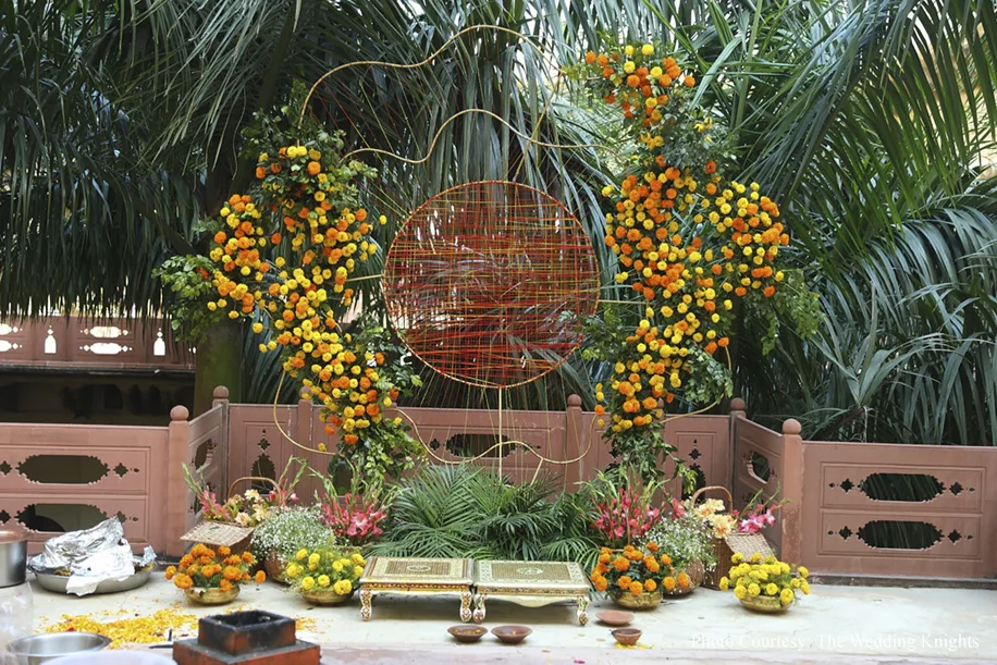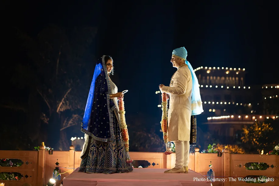 Tastefully set with candles, flowers and a gorgeous floral mandap right under the moon and the stars, the wedding day decor was straight out of a fairytale. The couple passed on the usual nuptial hues of red and pink and dazzled in matching ensembles of blue as they exchanged their varmalas to the chants of Raja Ram Sita Ram in the background surrounded by fireworks and simmering emotions of their families. The bride shares, “My Dadi said, ‘it seemed like all the gods had come on earth to bless you as a couple’, and that is something I will always carry with me.”