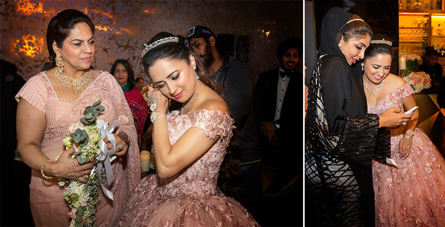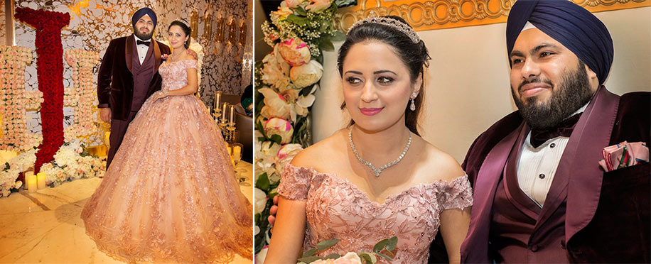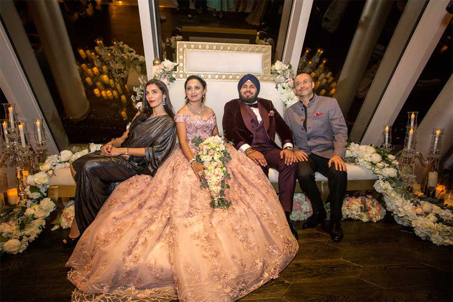 Their roka was celebrated at one of Dubai’s most iconic locations – the Burj Al Arab Jumeirah. Japinder wore a gorgeous pink princess ball gown that featured intricate embroidery and sparkling Swarovski crystals. The look was completed with a diamond-encrusted tiara, a solitaire set and bouquet of fresh flowers. Held at the hotel’s ‘Gold on 27’, the function saw prominent names in attendance such as Her Highness Shaikha Hend Al Qassemi, Ajay Kapoor (ex-T series director) and more.
