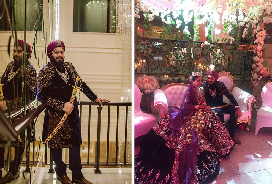 Manish Malhotra was the designer of choice for Japinder when it came to her reception lehenga. The rich color of the outfit was enhanced further by the patterns created using golden threads. With a 22-karat gold crown inlaid with diamonds, amethysts, and rubies on her head, the bride truly looked nothing less than a queen!