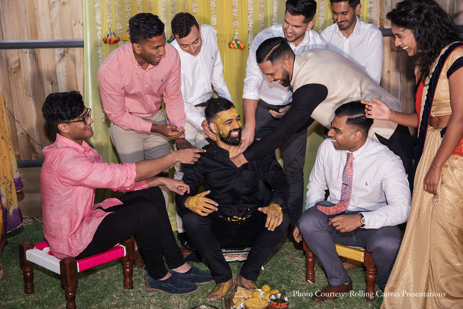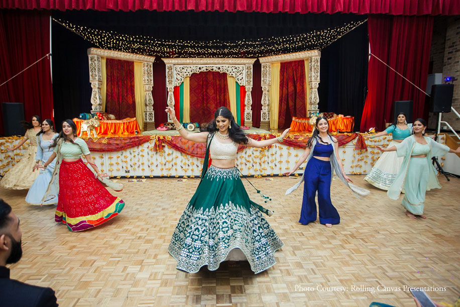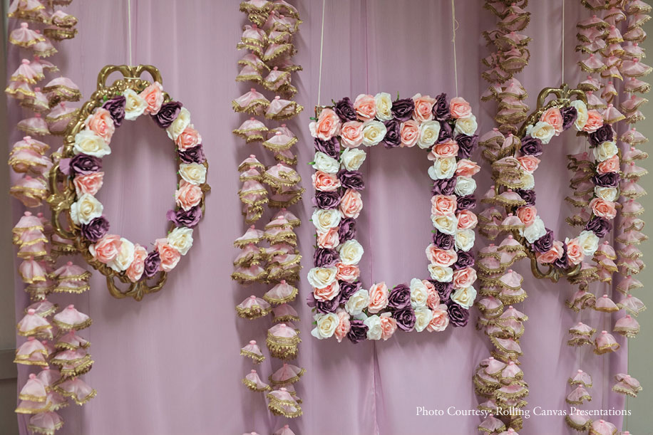 The bride donned a purple lehenga with exquisite blush embellishments by Manish Malhotra. The groom matched her in a purple bandi jacket. The floral affair was made memorable with a surprise entry by the groom, performances by the two mothers, aunties, and the bridesmaids, as well as an all-time favorite Bollywood medley. The highlight of the night was a ‘Mimosas and Samosas’ bar and a gift bar with old soul Bollywood lyrics for each type of gift.