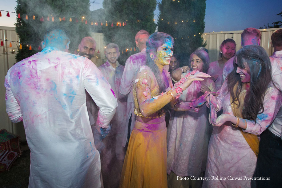 Jashan’s Haldi ceremony or ‘Maiyan’ was a sunny neon celebration followed by a holi party where everyone had a blast. She looked sunkissed in a yellow outfit by Arpita Mehta as her loved ones smeared her with turmeric before breaking out the colors for Holi fun.