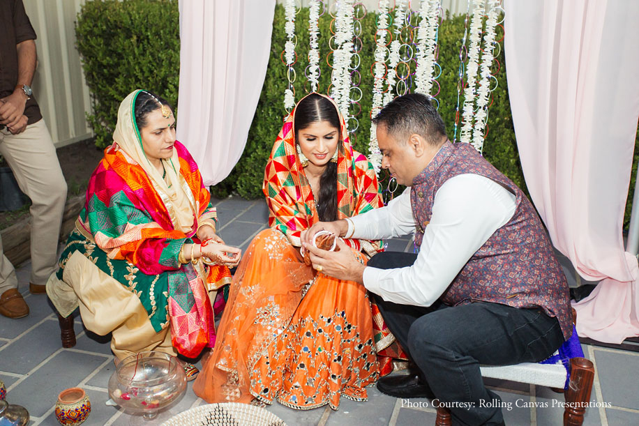 The traditional ‘Dhol Jaggo’ and ‘Chooda’ ceremony was a golden affair accented with jasmine flowers to bring out the vibrant orange of the couple’s outfits and the red of the bride’s bridal bangles. The ‘Dhol Jaggo’ celebration was a lively event where everyone took to the streets and houses of neighbours. The bride’s citrus sharara by Abhinav Mishra perfectly matched Karan’s warm peach outfit.