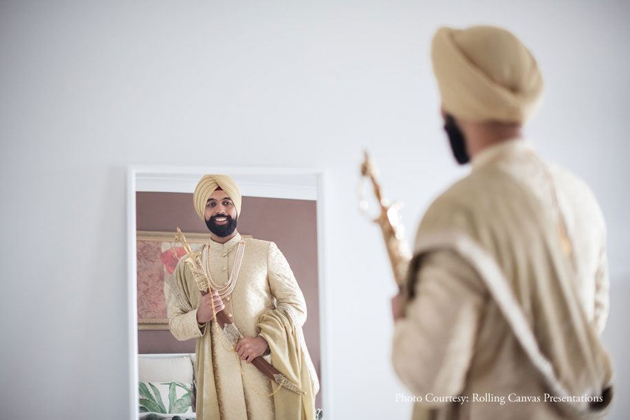 “We were adamant on the Four Seasons Sydney as our reception venue as the interiors and opulence of the hall suited our formal reception and outfits. The wedding ceremony took place at the Glenwood Gurdwara Sahib, with lunch at Grand Royale. Our sangeet venue was Cherrybrook Community Centre, which was decked out for the night in a Rajasthani theme, and my mehndi venue was Vinegar Hill Memorial Centre, which was splashed in florals. The rest of the events took place at our respective homes.”