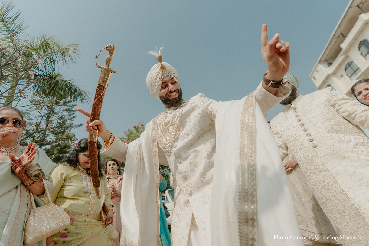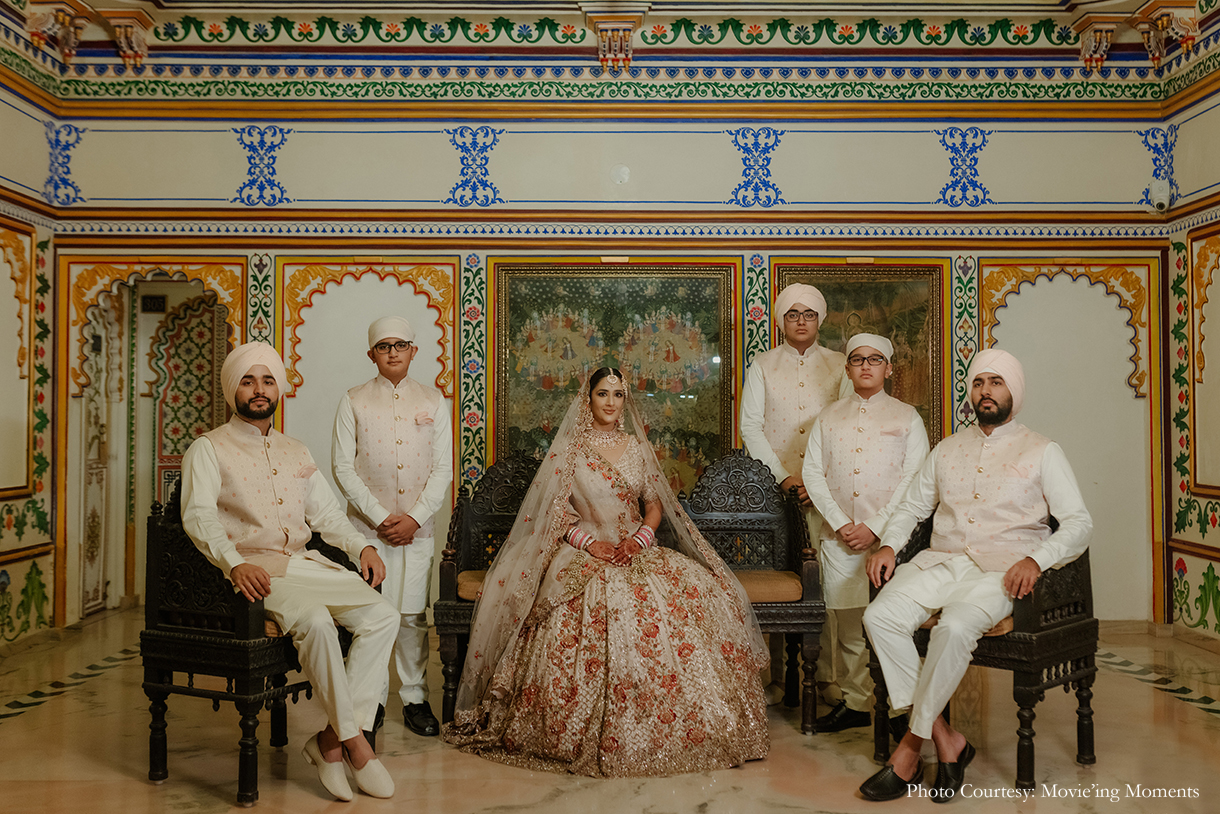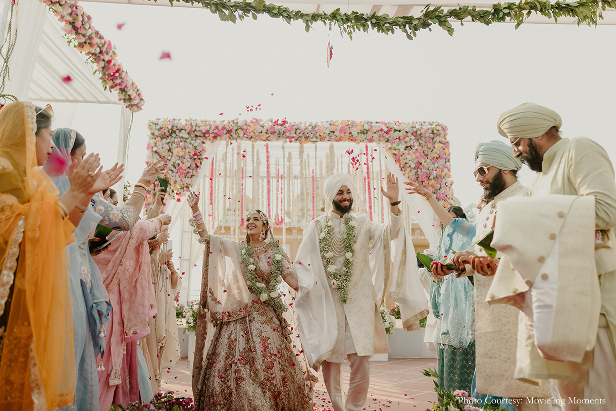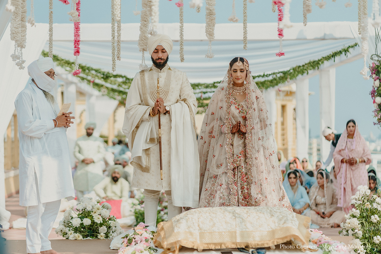 “The Wedding had two distinct segments – the Baarat and the Anand Karaj. Being proud Punjabis, they wanted the baarat to be a high-energy, exuberant celebration filled with Dhol, Boliyan, and the raw energy of Punjab. The Anand Karaj, on the other hand, was nothing short of heavenly, set around a serene palette of soft pink hues, perfectly complementing a crisp November afternoon in Udaipur.”