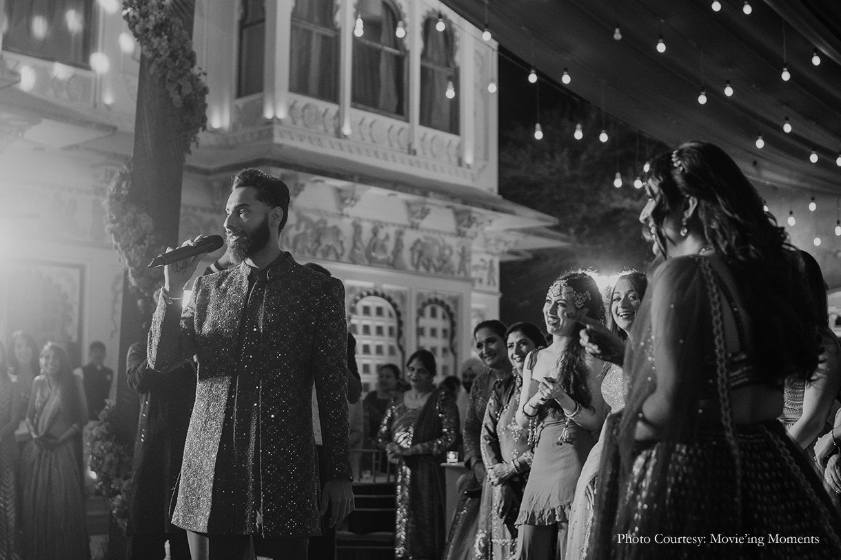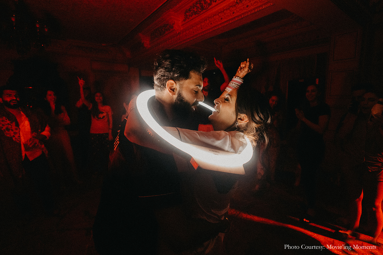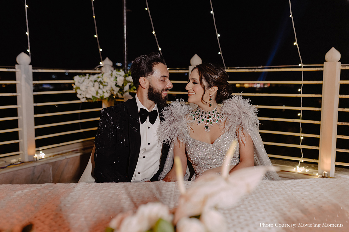 Inspired by the glitz and glam of Bollywood, the sangeet was a jaw-dropper with its vibrant hues and canopy of fairylights. Hosted under the starlit sky, the couple and their loved ones had a gala time shaking a leg on the dancefloor. They also exchanged rings while their guests cheered them on.