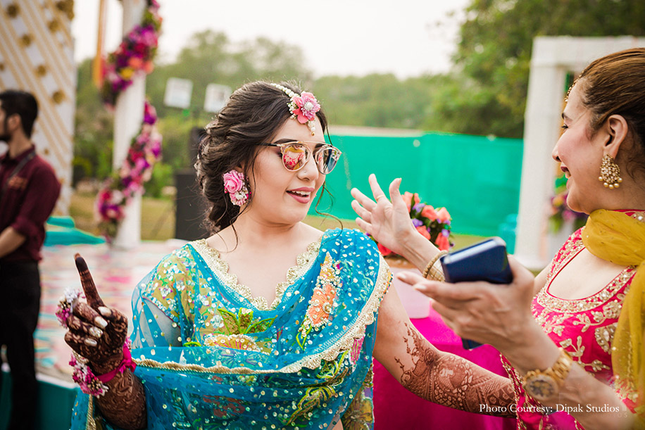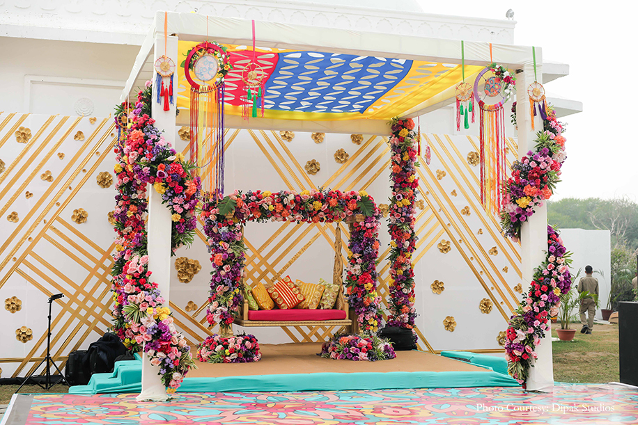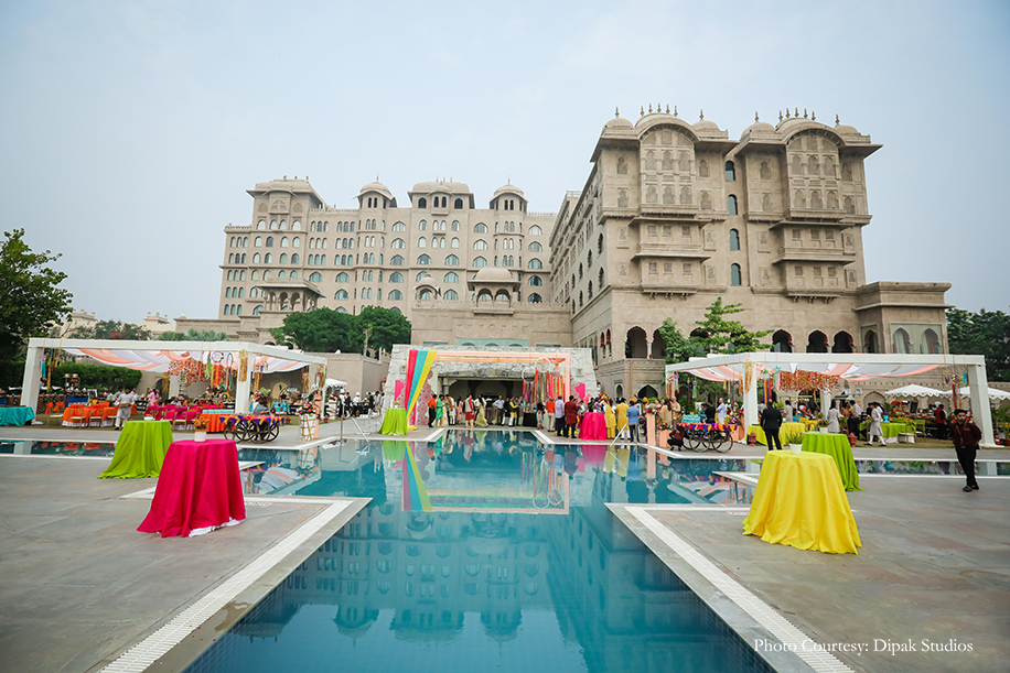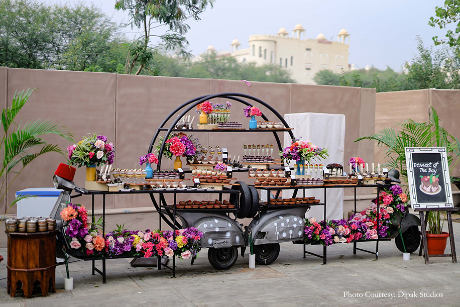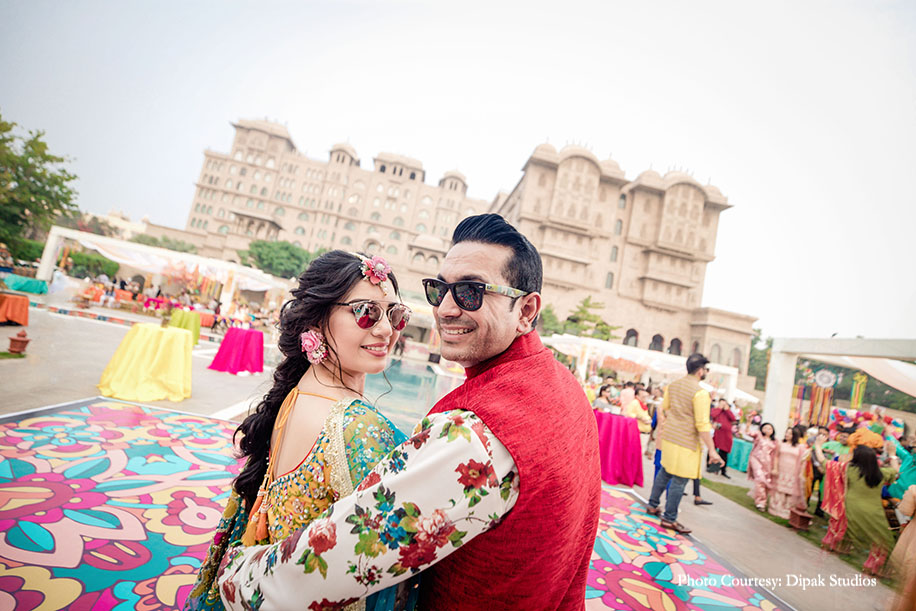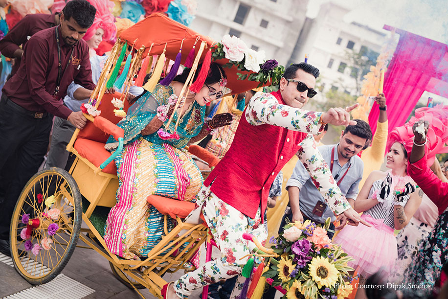 The couple followed the theme of ‘Shades of Love’ for the pool party and incorporated colorful elements in the decor by the poolside. The duo made a stunning entrance in vibrant outfits. She wore a yellow, pink and turquoise lehenga with heavy sequins work by Preeti S Kapoor, and he looked dapper in a floral kurta and a red jacket by Prima Czar. They were welcomed by color bombs and traditional drummers, as they made an entry riding a cycle rickshaw decorated with flowers. A flower backdrop with a polka-dotted scooty served as the perfect backdrop for a photo booth. There were mehndi stalls, bhangra dancers, a sheesha corner and tarot card readers to make this function a memorable one. They also had a cart full of giveaways such as bangles, bandhani dupattas, and clutches for the ladies.