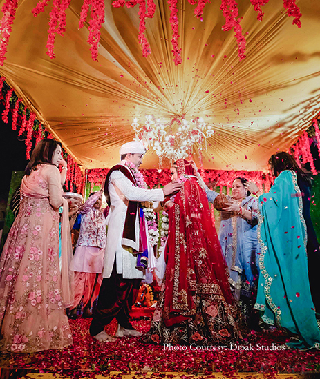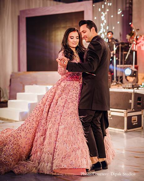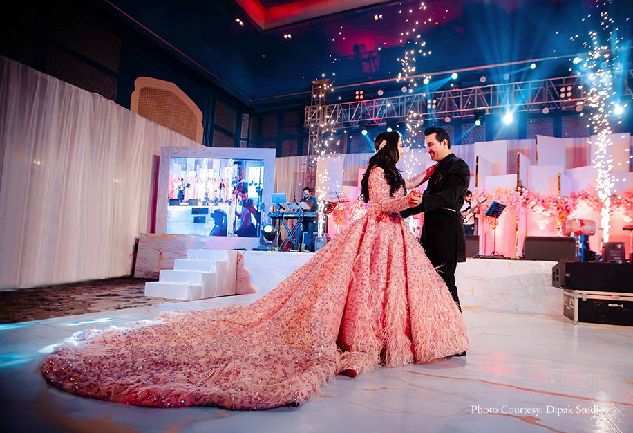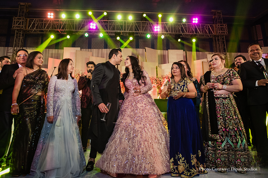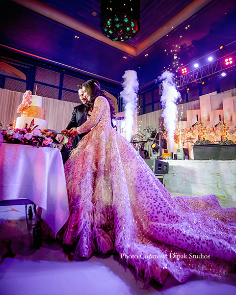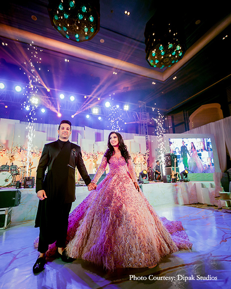 Their reception was nothing short of a grand affair. The venue was decorated with white satin drapes exuding royalty. There was a ‘paanwala’ (betel leaf seller) offering a delectable range of paans to the baraatis. They soon went into a merrymaking mood with nitrogen cookies, alcohol shots with smoke guns, and diverse flavored shots curated by Drinq. The newlyweds entered on a white carpet, and Jayshree looked lovely in a powder pink gown with a long trail by Val Taguba, and Sanjiv opted for a black, asymmetrical bandhgala by Shantanu & Nikhil.