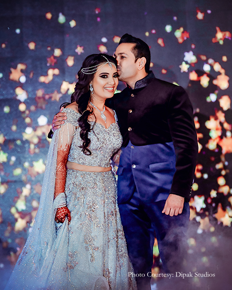 Following the theme of ‘Turkish Razzmatazz,’ Krayonz Entertainment transformed the entire venue into a Turkish haven using blue and silver crystals which were suspended from the ceiling. There were two ladies in traditional Turkish outfits welcoming the guests with flower petals and rosewater sprinklers, and four women dressed up as police taking rounds and giving shots to the guests as penalties. The couple danced the night away, and Jayshree looked fresh in a pastel green sequined gown by Dolly J, and he wore a bandhgala by Prima Czar for this fun event.