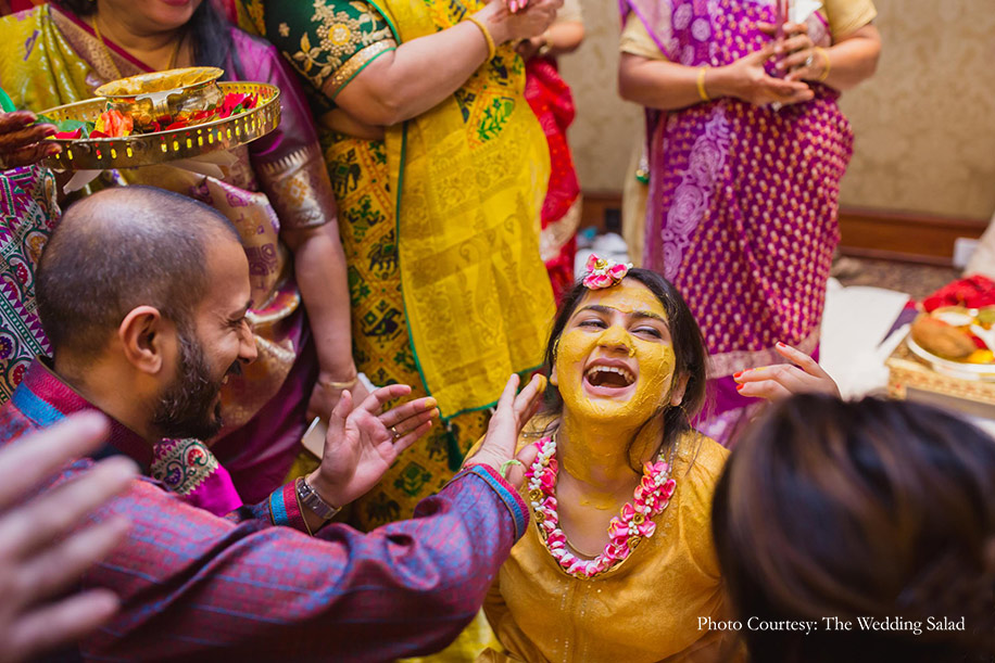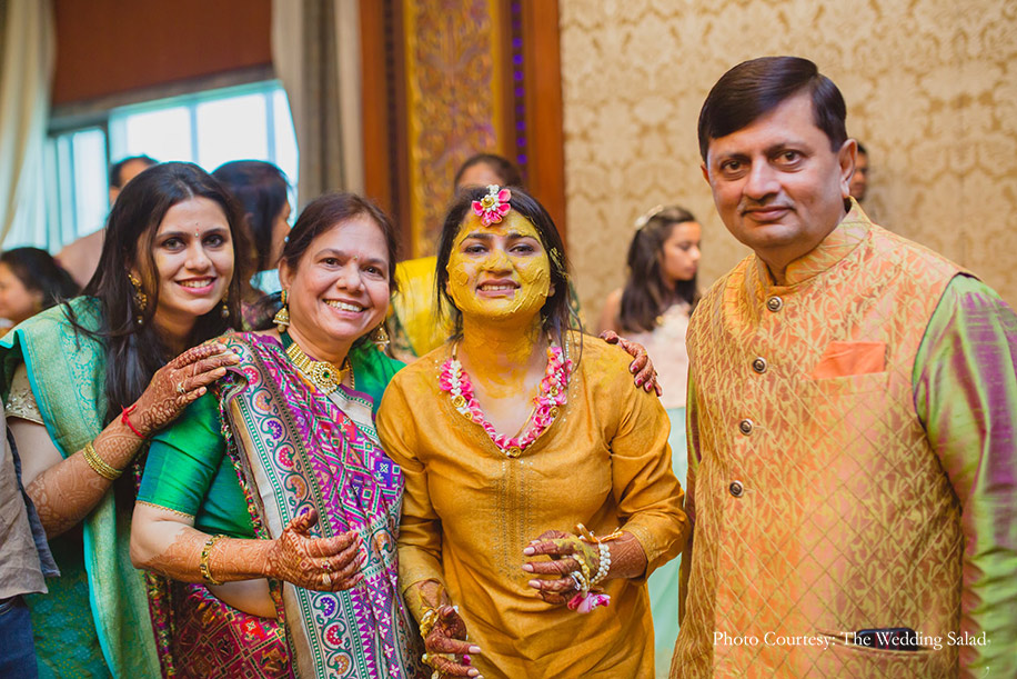 An intimate affair with close family members and friends present, Jinal and Rahul’s haldi took place separately. Following a traditional route, the decor was minimalist as the duo was playfully slathered with a mixture of haldi and yogurt to get their pre-wedding glow on.