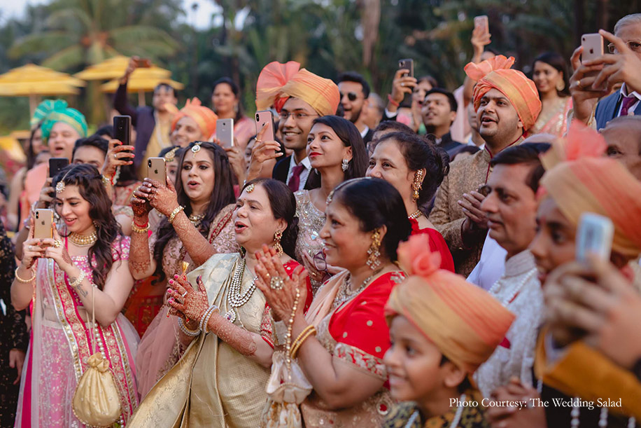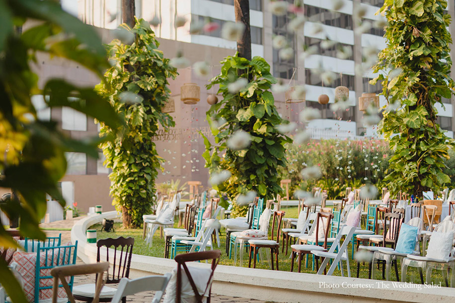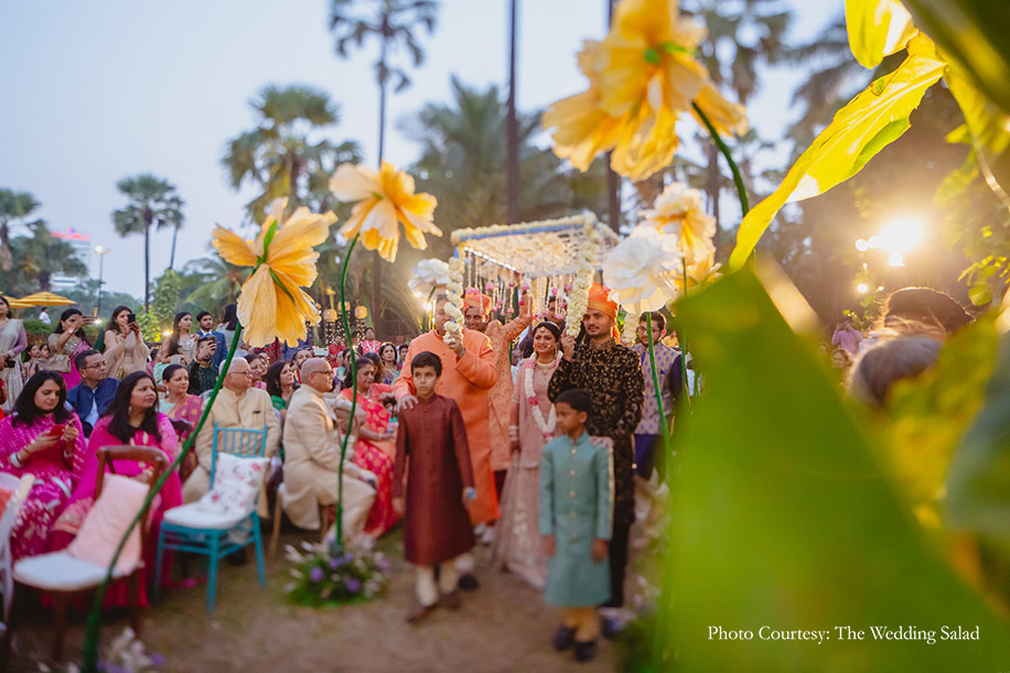 Replete with greenery and equipped with magnificent views of the beautiful Arabian Sea, the Taj Lands End’s sprawling poolside lawn was the chosen venue for the wedding. Impressed by the property’s grandeur, the couple also chose to execute their boisterous cocktail party at the same venue where they could easily shake a leg while experiencing the renowned hospitality of Taj. For the other functions the duo chose, Tote on the Turf for the mehndi, Hotel Sea Princess for the Haldi and Myrah along with Hyatt Regency for the sangeet.